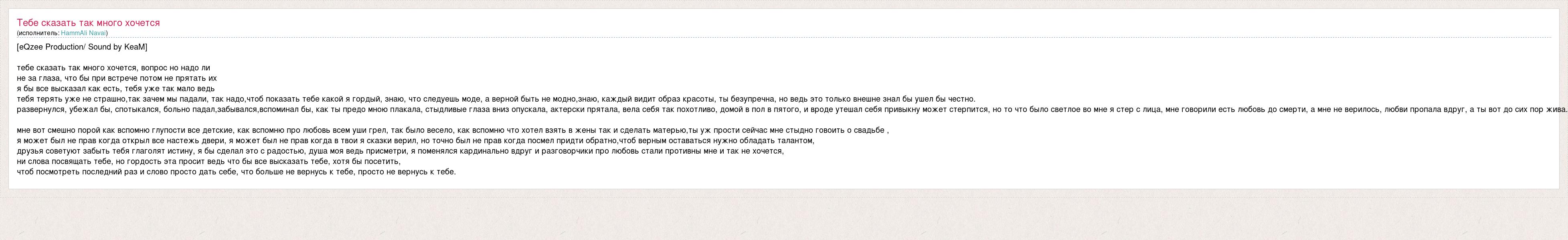 [eQzee Production/ Sound by KeaM] тебе сказать так много хочется, вопрос но надо ли не за глаза, что бы при встрече потом не прятать их я бы все высказал как есть, тебя уже так мало ведь тебя терять уже не страшно,так зачем мы падали, так надо,чтоб показать тебе какой я гордый, знаю, что следуешь моде, а верной быть не модно,знаю, каждый видит образ красоты, ты безупречна, но ведь это только внешне знал бы ушел бы честно. развернулся, убежал бы, спотыкался, больно падал,забывался,вспоминал бы, как ты предо мною плакала, стыдливые глаза вниз опускала, актерски прятала, вела себя так похотливо, домой в пол в пятого, и вроде утешал себя привыкну может стерпится, но то что было светлое во мне я стер с лица, мне говорили есть любовь до смерти, а мне не верилось, любви пропала вдруг, а ты вот до сих пор жива. мне вот смешно порой как вспомню глупости все детские, как вспомню про любовь всем уши грел, так было весело, как вспомню что хотел взять в жены так и сделать матерью,ты уж прости сейчас мне стыдно говоить о свадьбе , я может был не прав когда открыл все настежь двери, я может был не прав когда в твои я сказки верил, но точно был не прав когда посмел придти обратно,чтоб верным оставаться нужно обладать талантом, друзья советуют забыть тебя глаголят истину, я бы сделал это с радостью, душа моя ведь присметри, я поменялся кардинально вдруг и разговорчики про любовь стали противны мне и так не хочется, ни слова посвящать тебе, но гордость эта просит ведь что бы все высказать тебе, хотя бы посетить, чтоб посмотреть последний раз и слово просто дать себе, что больше не вернусь к тебе, просто не вернусь к тебе.