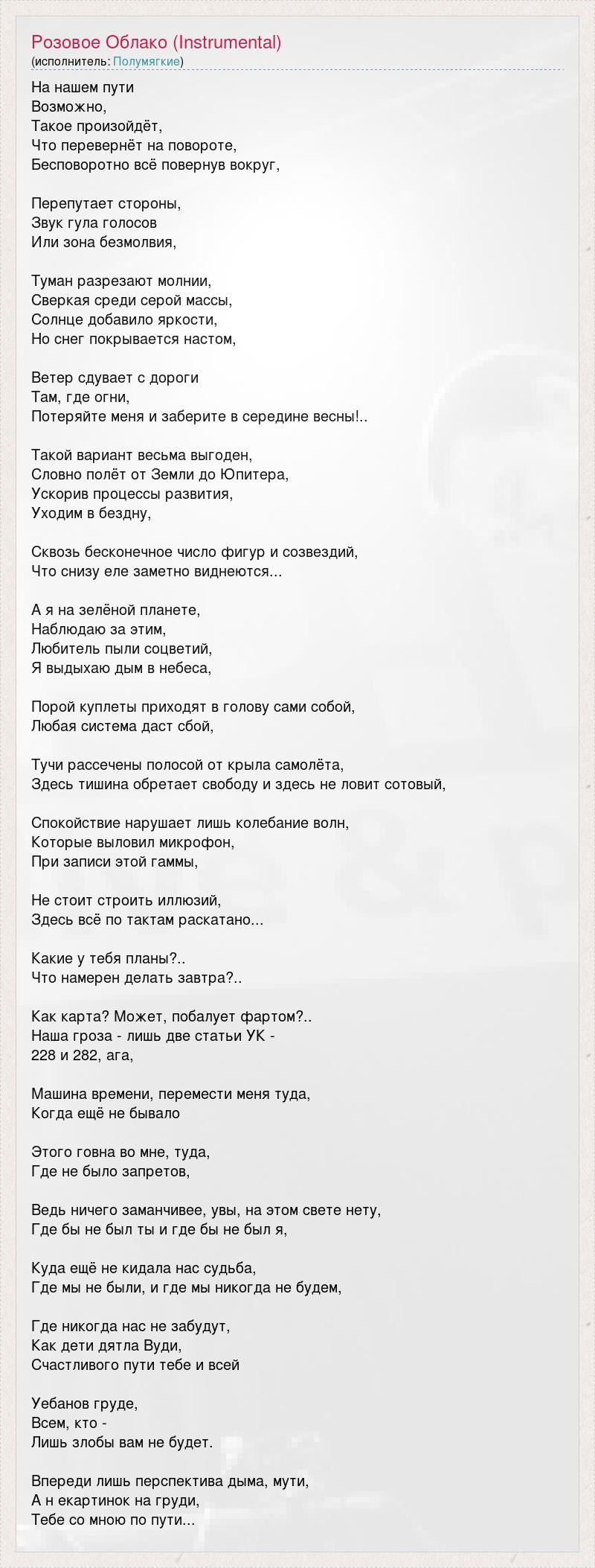 На нашем пути Возможно, Такое произойдёт, Что перевернёт на повороте, Бесповоротно всё повернув вокруг, Перепутает стороны, Звук гула голосов Или зона безмолвия, Туман разрезают молнии, Сверкая среди серой массы, Солнце добавило яркости, Но снег покрывается настом, Ветер сдувает с дороги Там, где огни, Потеряйте меня и заберите в середине весны!.. Такой вариант весьма выгоден, Словно полёт от Земли до Юпитера, Ускорив процессы развития, Уходим в бездну, Сквозь бесконечное число фигур и созвездий, Что снизу еле заметно виднеются... А я на зелёной планете, Наблюдаю за этим, Любитель пыли соцветий, Я выдыхаю дым в небеса, Порой куплеты приходят в голову сами собой, Любая система даст сбой, Тучи рассечены полосой от крыла самолёта, Здесь тишина обретает свободу и здесь не ловит сотовый, Спокойствие нарушает лишь колебание волн, Которые выловил микрофон, При записи этой гаммы, Не стоит строить иллюзий, Здесь всё по тактам раскатано... Какие у тебя планы?.. Что намерен делать завтра?.. Как карта? Может, побалует фартом?.. Наша гроза - лишь две статьи УК - 228 и 282, ага, Машина времени, перемести меня туда, Когда ещё не бывало Этого говна во мне, туда, Где не было запретов, Ведь ничего заманчивее, увы, на этом свете нету, Где бы не был ты и где бы не был я, Куда ещё не кидала нас судьба, Где мы не были, и где мы никогда не будем, Где никогда нас не забудут, Как дети дятла Вуди, Счастливого пути тебе и всей Уебанов груде, Всем, кто - Лишь злобы вам не будет. Впереди лишь перспектива дыма, мути, А н екартинок на груди, Тебе со мною по пути...