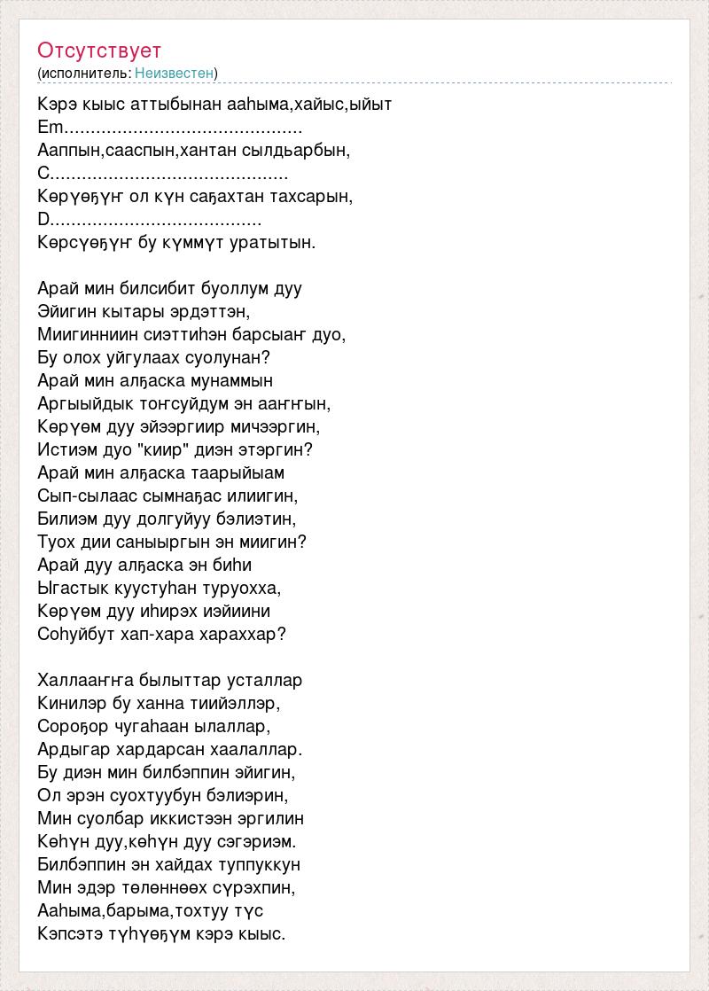 Кэрэ кыыс аттыбынан ааhыма,хайыс,ыйыт Em............................................. Ааппын,сааспын,хантан сылдьарбын, C............................................. Көрүөҕүҥ ол күн саҕахтан тахсарын, D........................................ Көрсүөҕүҥ бу күммүт уратытын. Арай мин билсибит буоллум дуу Эйигин кытары эрдэттэн, Миигинниин сиэттиhэн барсыаҥ дуо, Бу олох уйгулаах суолунан? Арай мин алҕаска мунаммын Аргыыйдык тоҥсуйдум эн ааҥҥын, Көрүөм дуу эйээргиир мичээргин, Истиэм дуо "киир" диэн этэргин? Арай мин алҕаска таарыйыам Сып-сылаас сымнаҕас илиигин, Билиэм дуу долгуйуу бэлиэтин, Туох дии саныыргын эн миигин? Арай дуу алҕаска эн биhи Ыгастык куустуhан туруохха, Көрүөм дуу иhирэх иэйиини Соhуйбут хап-хара хараххар? Халлааҥҥа былыттар усталлар Кинилэр бу ханна тиийэллэр, Сороҕор чугаhаан ылаллар, Ардыгар хардарсан хаалаллар. Бу диэн мин билбэппин эйигин, Ол эрэн суохтуубун бэлиэрин, Мин суолбар иккистээн эргилин Көhүн дуу,көhүн дуу сэгэриэм. Билбэппин эн хайдах туппуккун Мин эдэр төлөннөөх сүрэхпин, Ааhыма,барыма,тохтуу түс Кэпсэтэ түhүөҕүм кэрэ кыыс.