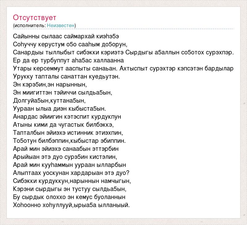 Сайынны сылаас саймархай киэhэ5э Соhуччу керустум о5о сааhым до5орун, Санардыы тыллыбыт сибэкки кэриэтэ Сырдыгы а5аллын со5отох сурэхпэр. Ер да ер турбуппут аhа5ас халлаанна Утары керсеммут ааспыты санаьан. Ахтыспыт сурэхтэр кэпсэтэн бардылар Урукку тапталы санаттан куедьутэн. Эн кэрэ5ин,эн нарыннын, Эн миигиттэн тэйиччи сылдьа5ын, Долгуйа5ын,куттана5ын, Уураан ылыа диэн кыбыста5ын. Анардас эйиигин кэтэспит курдукпун Атыны кими да чугастык билбэккэ, Тапталбын эйиэхэ истинник этиэхпин, То5отун билбэппин,кыбыстар эбиппин. Арай мин эйиэхэ санаабын эттэрбин Арыйыан этэ дуо сурэ5ин кистэлин, Арай мин кууhаммын уураан ылларбын Алыптаах уоскунан хардарыан этэ дуо? Сибэкки курдуккун,нарыннын намчыгын, Кэрэни сырдыгы эн тустуу сылдьа5ын, Бу сырдык олоххо эн кемус буоланнын Хоhоонно хоhуллууй,ырыа5а ылланыый.