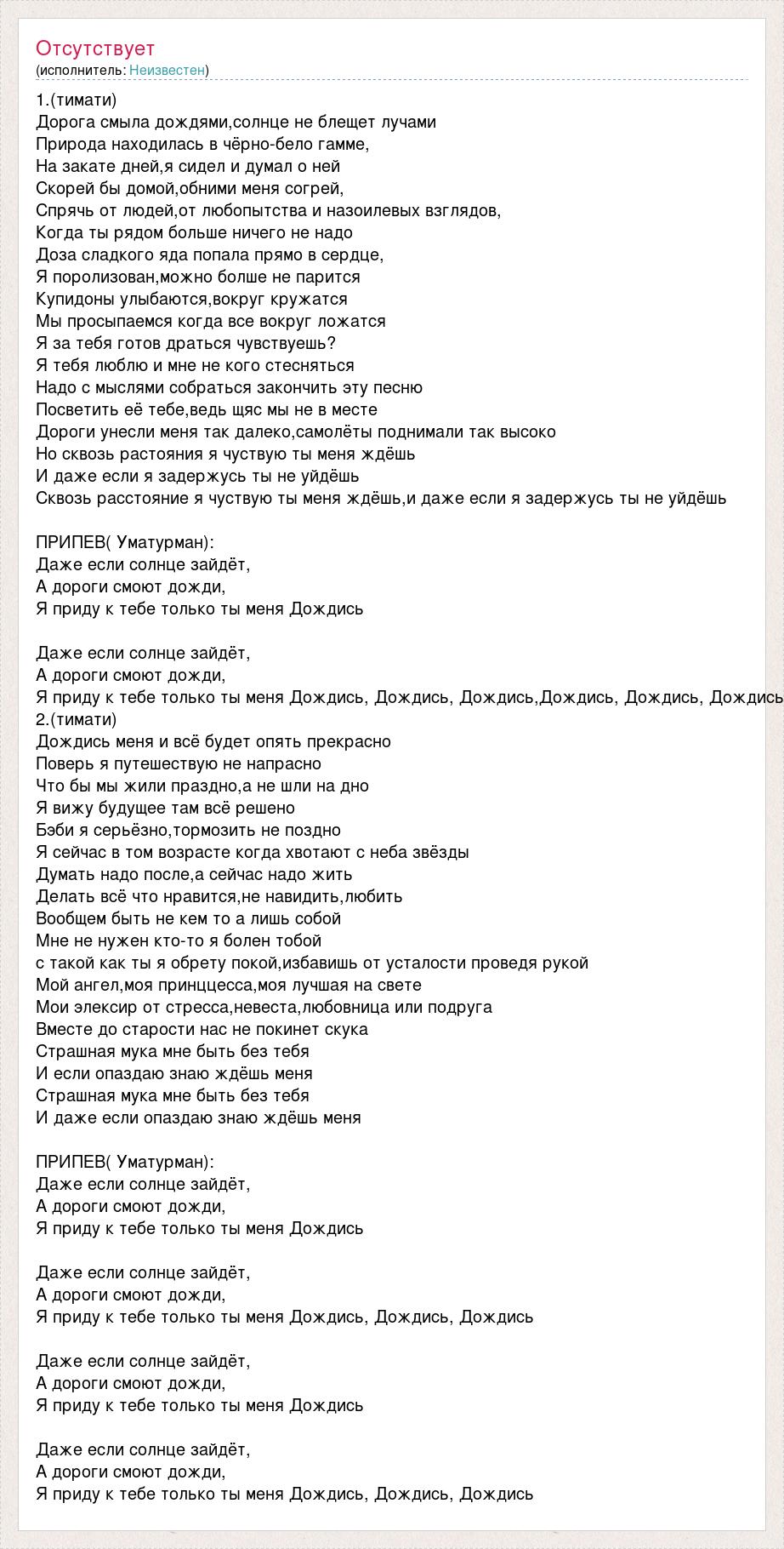 1.(тимати) Дорога смыла дождями,солнце не блещет лучами Природа находилась в чёрно-бело гамме, На закате дней,я сидел и думал о ней Скорей бы домой,обними меня согрей, Спрячь от людей,от любопытства и назоилевых взглядов, Когда ты рядом больше ничего не надо Доза сладкого яда попала прямо в сердце, Я поролизован,можно болше не парится Купидоны улыбаются,вокруг кружатся Мы просыпаемся когда все вокруг ложатся Я за тебя готов драться чувствуешь? Я тебя люблю и мне не кого стесняться Надо с мыслями собраться закончить эту песню Посветить её тебе,ведь щяс мы не в месте Дороги унесли меня так далеко,самолёты поднимали так высоко Но сквозь растояния я чуствую ты меня ждёшь И даже если я задержусь ты не уйдёшь Сквозь расстояние я чуствую ты меня ждёшь,и даже если я задержусь ты не уйдёшь ПРИПЕВ( Уматурман): Даже если солнце зайдёт, А дороги смоют дожди, Я приду к тебе только ты меня Дождись Даже если солнце зайдёт, А дороги смоют дожди, Я приду к тебе только ты меня Дождись, Дождись, Дождись,Дождись, Дождись, Дождись 2.(тимати) Дождись меня и всё будет опять прекрасно Поверь я путешествую не напрасно Что бы мы жили праздно,а не шли на дно Я вижу будущее там всё решено Бэби я серьёзно,тормозить не поздно Я сейчас в том возрасте когда хвотают с неба звёзды Думать надо после,а сейчас надо жить Делать всё что нравится,не навидить,любить Вообщем быть не кем то а лишь собой Мне не нужен кто-то я болен тобой с такой как ты я обрету покой,избавишь от усталости проведя рукой Мой ангел,моя принццесса,моя лучшая на свете Мои элексир от стресса,невеста,любовница или подруга Вместе до старости нас не покинет скука Страшная мука мне быть без тебя И если опаздаю знаю ждёшь меня Страшная мука мне быть без тебя И даже если опаздаю знаю ждёшь меня ПРИПЕВ( Уматурман): Даже если солнце зайдёт, А дороги смоют дожди, Я приду к тебе только ты меня Дождись Даже если солнце зайдёт, А дороги смоют дожди, Я приду к тебе только ты меня Дождись, Дождись, Дождись Даже если солнце зайдёт, А дороги смоют дожди, Я приду к тебе только ты меня Дождись Даже если солнце зайдёт, А дороги смоют дожди, Я приду к тебе только ты меня Дождись, Дождись, Дождись