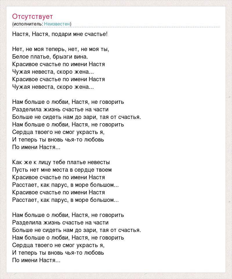Настя, Настя, подари мне счастье! Нет, не моя теперь, нет, не моя ты, Белое платье, брызги вина. Красивое счастье по имени Настя Чужая невеста, скоро жена... Красивое счастье по имени Настя Чужая невеста, скоро жена... Нам больше о любви, Настя, не говорить Разделила жизнь счастье на части Больше не сидеть нам до зари, тая от счастья. Нам больше о любви, Настя, не говорить Сердца твоего не смог украсть я, И теперь ты вновь чья-то любовь По имени Настя... Как же к лицу тебе платье невесты Пусть нет мне места в сердце твоем Красивое счастье по имени Настя Расстает, как парус, в море большом... Красивое счастье по имени Настя Расстает, как парус, в море большом... Нам больше о любви, Настя, не говорить Разделила жизнь счастье на части Больше не сидеть нам до зари, тая от счастья. Нам больше о любви, Настя, не говорить Сердца твоего не смог украсть я, И теперь ты вновь чья-то любовь По имени Настя...