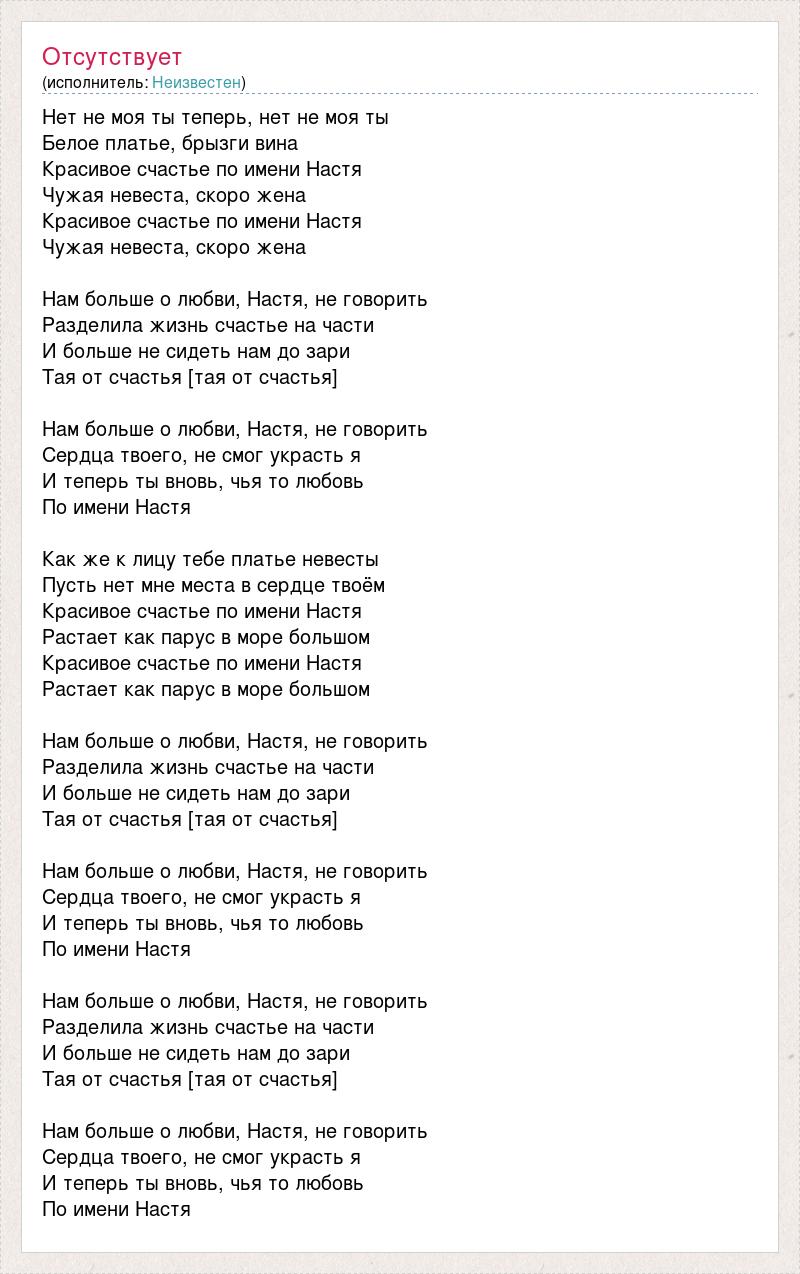 Нет не моя ты теперь, нет не моя ты Белое платье, брызги вина Красивое счастье по имени Настя Чужая невеста, скоро жена Красивое счастье по имени Настя Чужая невеста, скоро жена Нам больше о любви, Настя, не говорить Разделила жизнь счастье на части И больше не сидеть нам до зари Тая от счастья [тая от счастья] Нам больше о любви, Настя, не говорить Сердца твоего, не смог украсть я И теперь ты вновь, чья то любовь По имени Настя Как же к лицу тебе платье невесты Пусть нет мне места в сердце твоём Красивое счастье по имени Настя Растает как парус в море большом Красивое счастье по имени Настя Растает как парус в море большом Нам больше о любви, Настя, не говорить Разделила жизнь счастье на части И больше не сидеть нам до зари Тая от счастья [тая от счастья] Нам больше о любви, Настя, не говорить Сердца твоего, не смог украсть я И теперь ты вновь, чья то любовь По имени Настя Нам больше о любви, Настя, не говорить Разделила жизнь счастье на части И больше не сидеть нам до зари Тая от счастья [тая от счастья] Нам больше о любви, Настя, не говорить Сердца твоего, не смог украсть я И теперь ты вновь, чья то любовь По имени Настя