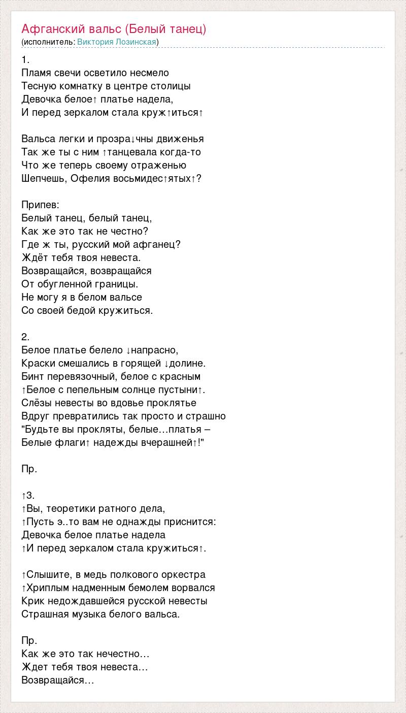 1. Пламя свечи осветило несмело Тесную комнатку в центре столицы Девочка белое↑ платье надела, И перед зеркалом стала круж↑иться↑ Вальса легки и прозра↓чны движенья Так же ты с ним ↑танцевала когда-то Что же теперь своему отраженью Шепчешь, Офелия восьмидес↑ятых↑? Припев: Белый танец, белый танец, Как же это так не честно? Где ж ты, русский мой афганец? Ждёт тебя твоя невеста. Возвращайся, возвращайся От обугленной границы. Не могу я в белом вальсе Со своей бедой кружиться. 2. Белое платье белело ↓напрасно, Краски смешались в горящей ↓долине. Бинт перевязочный, белое с красным ↑Белое с пепельным солнце пустыни↑. Слёзы невесты во вдовье проклятье Вдруг превратились так просто и страшно "Будьте вы прокляты, белые…платья – Белые флаги↑ надежды вчерашней↑!" Пр. ↑3. ↑Вы, теоретики ратного дела, ↑Пусть э..то вам не однажды приснится: Девочка белое платье надела ↑И перед зеркалом стала кружиться↑. ↑Слышите, в медь полкового оркестра ↑Хриплым надменным бемолем ворвался Крик недождавшейся русской невесты Страшная музыка белого вальса. Пр. Как же это так нечестно… Ждет тебя твоя невеста… Возвращайся…