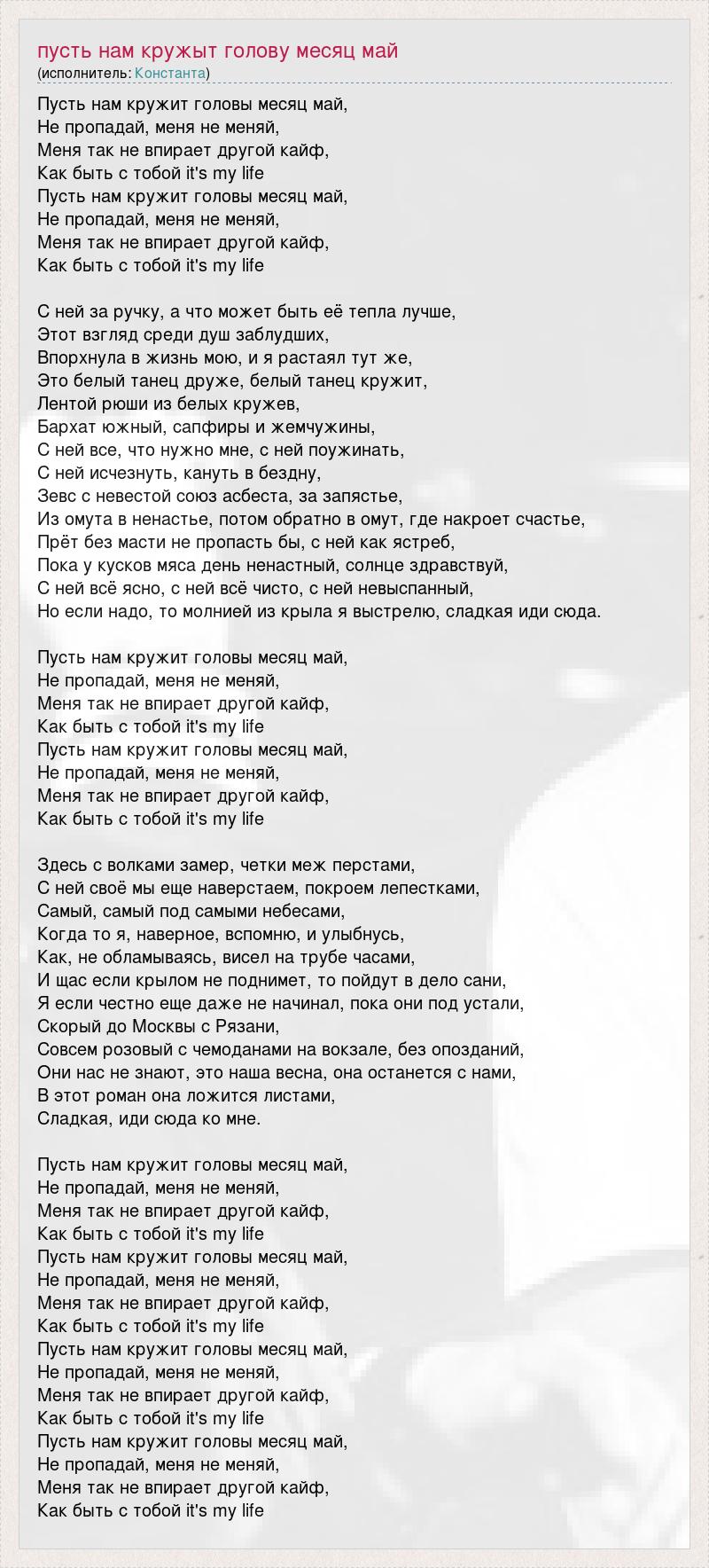 Пусть нам кружит головы месяц май, Не пропадай, меня не меняй, Меня так не впирает другой кайф, Как быть с тобой it's my life Пусть нам кружит головы месяц май, Не пропадай, меня не меняй, Меня так не впирает другой кайф, Как быть с тобой it's my life С ней за ручку, а что может быть её тепла лучше, Этот взгляд среди душ заблудших, Впорхнула в жизнь мою, и я растаял тут же, Это белый танец друже, белый танец кружит, Лентой рюши из белых кружев, Бархат южный, сапфиры и жемчужины, С ней все, что нужно мне, с ней поужинать, С ней исчезнуть, кануть в бездну, Зевс с невестой союз асбеста, за запястье, Из омута в ненастье, потом обратно в омут, где накроет счастье, Прёт без масти не пропасть бы, с ней как ястреб, Пока у кусков мяса день ненастный, солнце здравствуй, С ней всё ясно, с ней всё чисто, с ней невыспанный, Но если надо, то молнией из крыла я выстрелю, сладкая иди сюда. Пусть нам кружит головы месяц май, Не пропадай, меня не меняй, Меня так не впирает другой кайф, Как быть с тобой it's my life Пусть нам кружит головы месяц май, Не пропадай, меня не меняй, Меня так не впирает другой кайф, Как быть с тобой it's my life Здесь с волками замер, четки меж перстами, С ней своё мы еще наверстаем, покроем лепестками, Самый, самый под самыми небесами, Когда то я, наверное, вспомню, и улыбнусь, Как, не обламываясь, висел на трубе часами, И щас если крылом не поднимет, то пойдут в дело сани, Я если честно еще даже не начинал, пока они под устали, Скорый до Москвы с Рязани, Совсем розовый с чемоданами на вокзале, без опозданий, Они нас не знают, это наша весна, она останется с нами, В этот роман она ложится листами, Сладкая, иди сюда ко мне. Пусть нам кружит головы месяц май, Не пропадай, меня не меняй, Меня так не впирает другой кайф, Как быть с тобой it's my life Пусть нам кружит головы месяц май, Не пропадай, меня не меняй, Меня так не впирает другой кайф, Как быть с тобой it's my life Пусть нам кружит головы месяц май, Не пропадай, меня не меняй, Меня так не впирает другой кайф, Как быть с тобой it's my life Пусть нам кружит головы месяц май, Не пропадай, меня не меняй, Меня так не впирает другой кайф, Как быть с тобой it's my life
