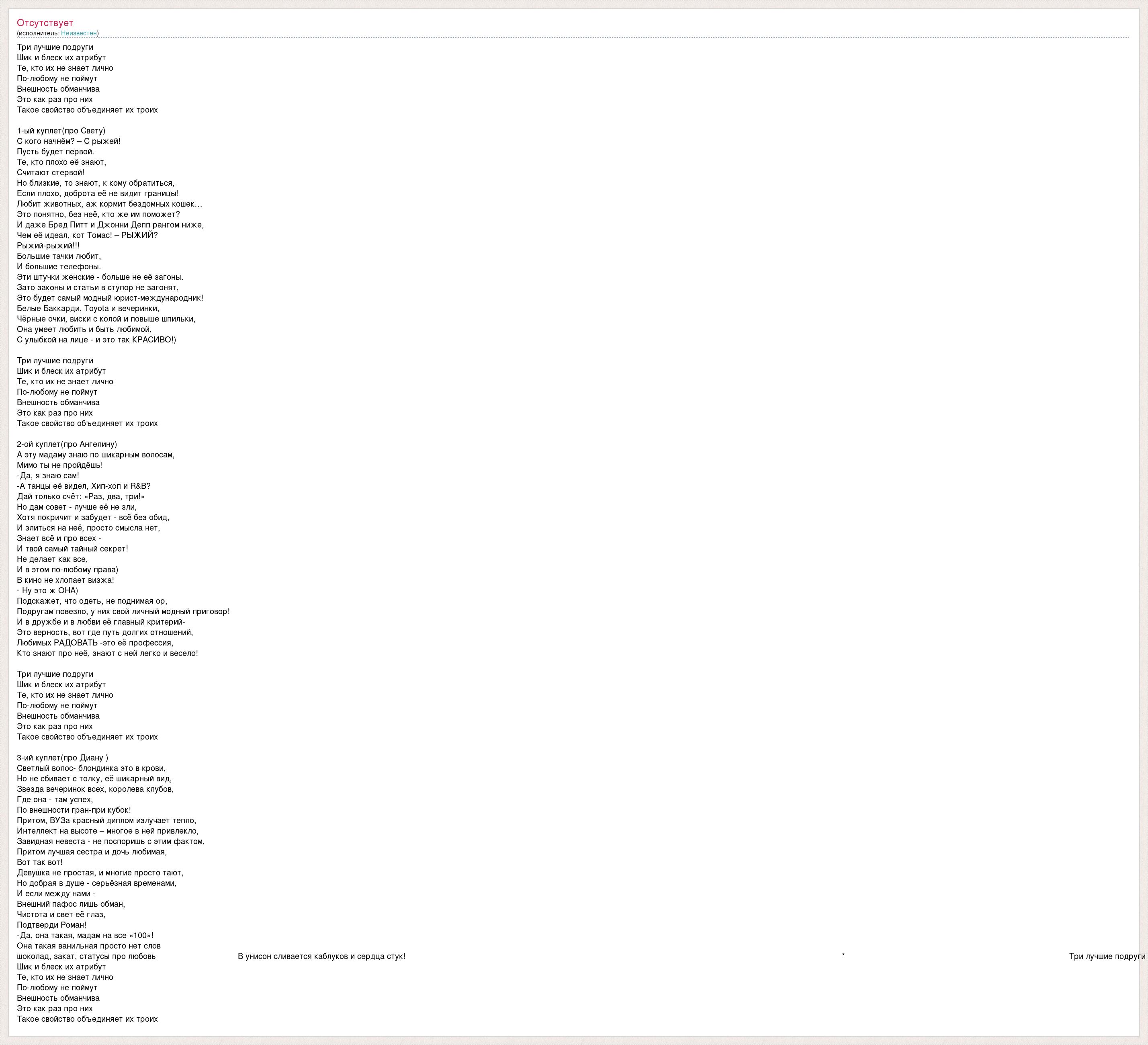 Три лучшие подруги Шик и блеск их атрибут Те, кто их не знает лично По-любому не поймут Внешность обманчива Это как раз про них Такое свойство объединяет их троих 1-ый куплет(про Свету) С кого начнём? – С рыжей! Пусть будет первой. Те, кто плохо её знают, Считают стервой! Но близкие, то знают, к кому обратиться, Если плохо, доброта её не видит границы! Любит животных, аж кормит бездомных кошек… Это понятно, без неё, кто же им поможет? И даже Бред Питт и Джонни Депп рангом ниже, Чем её идеал, кот Томас! – РЫЖИЙ? Рыжий-рыжий!!! Большие тачки любит, И большие телефоны. Эти штучки женские - больше не её загоны. Зато законы и статьи в ступор не загонят, Это будет самый модный юрист-международник! Белые Баккарди, Toyota и вечеринки, Чёрные очки, виски с колой и повыше шпильки, Она умеет любить и быть любимой, С улыбкой на лице - и это так КРАСИВО!) Три лучшие подруги Шик и блеск их атрибут Те, кто их не знает лично По-любому не поймут Внешность обманчива Это как раз про них Такое свойство объединяет их троих 2-ой куплет(про Ангелину) А эту мадаму знаю по шикарным волосам, Мимо ты не пройдёшь! -Да, я знаю сам! -А танцы её видел, Хип-хоп и R&B? Дай только счёт: «Раз, два, три!» Но дам совет - лучше её не зли, Хотя покричит и забудет - всё без обид, И злиться на неё, просто смысла нет, Знает всё и про всех - И твой самый тайный секрет! Не делает как все, И в этом по-любому права) В кино не хлопает визжа! - Ну это ж ОНА) Подскажет, что одеть, не поднимая ор, Подругам повезло, у них свой личный модный приговор! И в дружбе и в любви её главный критерий- Это верность, вот где путь долгих отношений, Любимых РАДОВАТЬ -это её профессия, Кто знают про неё, знают с ней легко и весело! Три лучшие подруги Шик и блеск их атрибут Те, кто их не знает лично По-любому не поймут Внешность обманчива Это как раз про них Такое свойство объединяет их троих 3-ий куплет(про Диану ) Светлый волос- блондинка это в крови, Но не сбивает с толку, её шикарный вид, Звезда вечеринок всех, королева клубов, Где она - там успех, По внешности гран-при кубок! Притом, ВУЗа красный диплом излучает тепло, Интеллект на высоте – многое в ней привлекло, Завидная невеста - не поспоришь с этим фактом, Притом лучшая сестра и дочь любимая, Вот так вот! Девушка не простая, и многие просто тают, Но добрая в душе - серьёзная временами, И если между нами - Внешний пафос лишь обман, Чистота и свет её глаз, Подтверди Роман! -Да, она такая, мадам на все «100»! Она такая ванильная просто нет слов шоколад, закат, статусы про любовь В унисон сливается каблуков и сердца стук! * Три лучшие подруги Шик и блеск их атрибут Те, кто их не знает лично По-любому не поймут Внешность обманчива Это как раз про них Такое свойство объединяет их троих