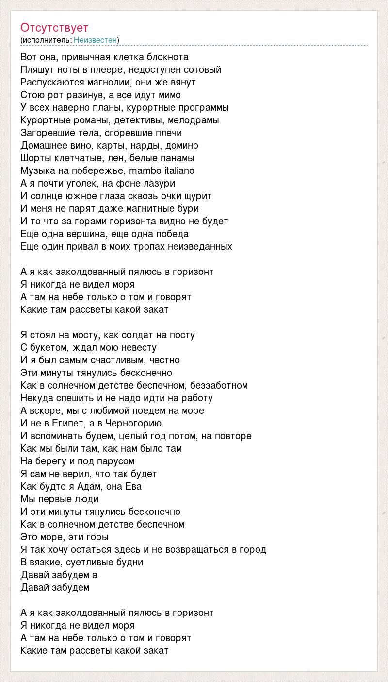 Вот она, привычная клетка блокнота Пляшут ноты в плеере, недоступен сотовый Распускаются магнолии, они же вянут Стою рот разинув, а все идут мимо У всех наверно планы, курортные программы Курортные романы, детективы, мелодрамы Загоревшие тела, сгоревшие плечи Домашнее вино, карты, нарды, домино Шорты клетчатые, лен, белые панамы Музыка на побережье, mambo italiano А я почти уголек, на фоне лазури И солнце южное глаза сквозь очки щурит И меня не парят даже магнитные бури И то что за горами горизонта видно не будет Еще одна вершина, еще одна победа Еще один привал в моих тропах неизведанных А я как заколдованный пялюсь в горизонт Я никогда не видел моря А там на небе только о том и говорят Какие там рассветы какой закат Я стоял на мосту, как солдат на посту С букетом, ждал мою невесту И я был самым счастливым, честно Эти минуты тянулись бесконечно Как в солнечном детстве беспечном, беззаботном Некуда спешить и не надо идти на работу А вскоре, мы с любимой поедем на море И не в Египет, а в Черногорию И вспоминать будем, целый год потом, на повторе Как мы были там, как нам было там На берегу и под парусом Я сам не верил, что так будет Как будто я Адам, она Ева Мы первые люди И эти минуты тянулись бесконечно Как в солнечном детстве беспечном Это море, эти горы Я так хочу остаться здесь и не возвращаться в город В вязкие, суетливые будни Давай забудем а Давай забудем А я как заколдованный пялюсь в горизонт Я никогда не видел моря А там на небе только о том и говорят Какие там рассветы какой закат