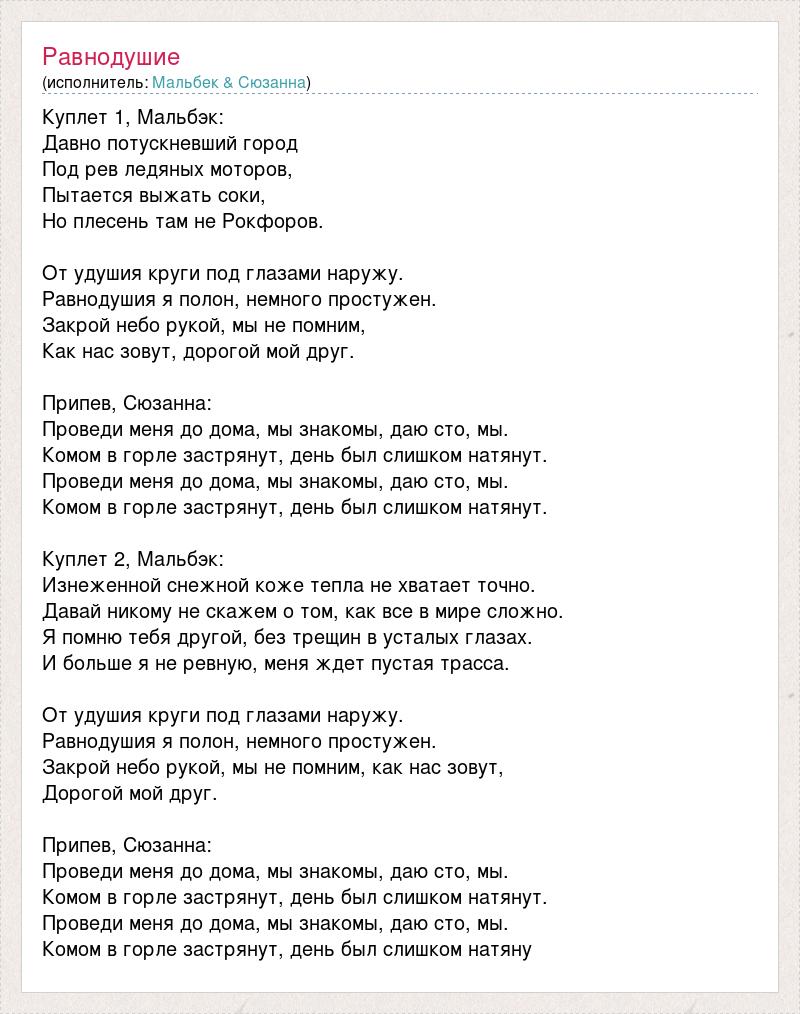 Куплет 1, Мальбэк: Давно потускневший город Под рев ледяных моторов, Пытается выжать соки, Но плесень там не Рокфоров. От удушия круги под глазами наружу. Равнодушия я полон, немного простужен. Закрой небо рукой, мы не помним, Как нас зовут, дорогой мой друг. Припев, Сюзанна: Проведи меня до дома, мы знакомы, даю сто, мы. Комом в горле застрянут, день был слишком натянут. Проведи меня до дома, мы знакомы, даю сто, мы. Комом в горле застрянут, день был слишком натянут. Куплет 2, Мальбэк: Изнеженной снежной коже тепла не хватает точно. Давай никому не скажем о том, как все в мире сложно. Я помню тебя другой, без трещин в усталых глазах. И больше я не ревную, меня ждет пустая трасса. От удушия круги под глазами наружу. Равнодушия я полон, немного простужен. Закрой небо рукой, мы не помним, как нас зовут, Дорогой мой друг. Припев, Сюзанна: Проведи меня до дома, мы знакомы, даю сто, мы. Комом в горле застрянут, день был слишком натянут. Проведи меня до дома, мы знакомы, даю сто, мы. Комом в горле застрянут, день был слишком натяну