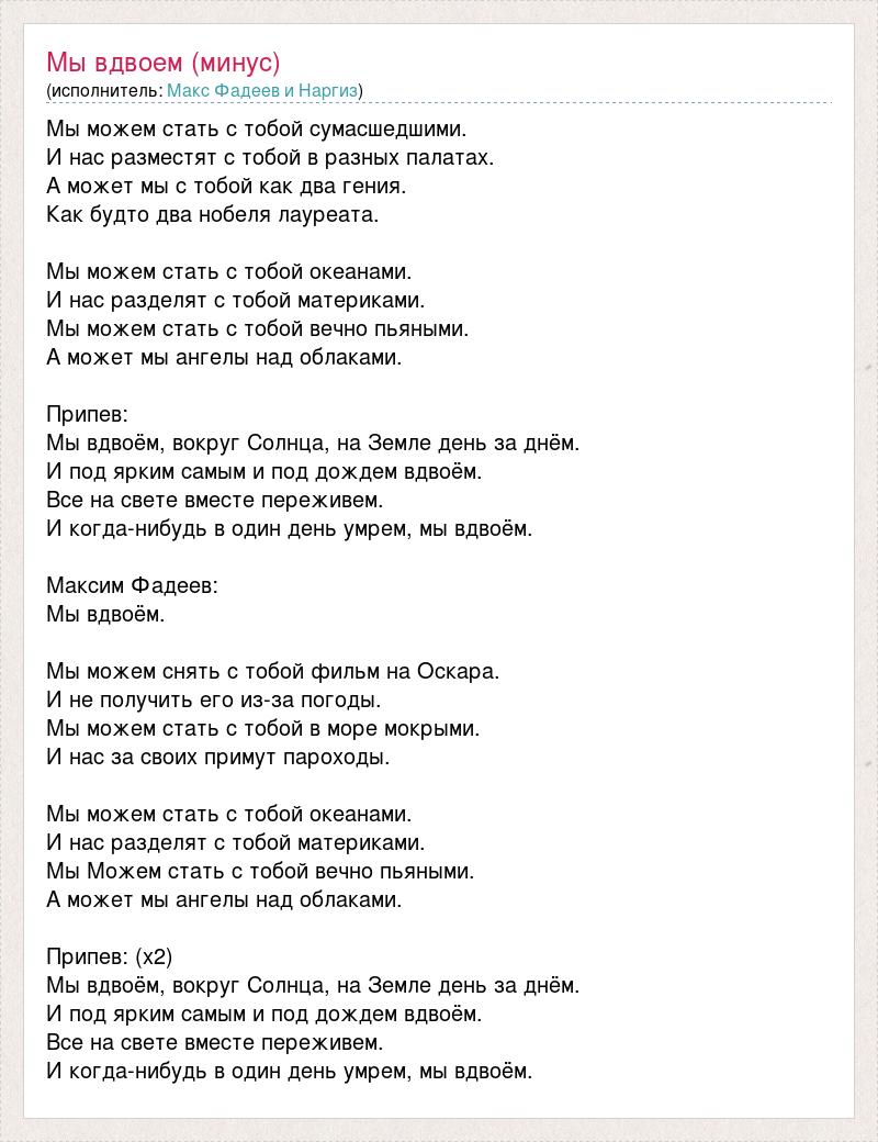 Мы можем стать с тобой сумасшедшими. И нас разместят с тобой в разных палатах. А может мы с тобой как два гения. Как будто два нобеля лауреата. Мы можем стать с тобой океанами. И нас разделят с тобой материками. Мы можем стать с тобой вечно пьяными. А может мы ангелы над облаками. Припев: Мы вдвоём, вокруг Солнца, на Земле день за днём. И под ярким самым и под дождем вдвоём. Все на свете вместе переживем. И когда-нибудь в один день умрем, мы вдвоём. Максим Фадеев: Мы вдвоём. Мы можем снять с тобой фильм на Оскара. И не получить его из-за погоды. Мы можем стать с тобой в море мокрыми. И нас за своих примут пароходы. Мы можем стать с тобой океанами. И нас разделят с тобой материками. Мы Можем стать с тобой вечно пьяными. А может мы ангелы над облаками. Припев: (х2) Мы вдвоём, вокруг Солнца, на Земле день за днём. И под ярким самым и под дождем вдвоём. Все на свете вместе переживем. И когда-нибудь в один день умрем, мы вдвоём.