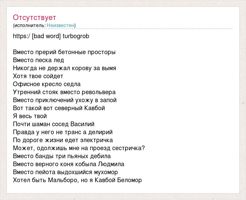 https:/ [bad word] turbogrob Вместо прерий бетонные просторы Вместо песка лед Никогда не держал корову за вымя Хотя твое сойдет Офисное кресло седла Утренний стояк вместо револьвера Вместо приключений ухожу в запой Вот такой вот северный Кавбой Я весь твой Почти шаман сосед Василий Правда у него не транс а делирий По дороге жизни едет электричка Может, одолжишь мне на проезд сестричка? Вместо банды три пьяных дебила Вместо верного коня кобыла Людмила Вместо пейота выдохшийся мухомор Хотел быть Мальборо, но я Кавбой Беломор
