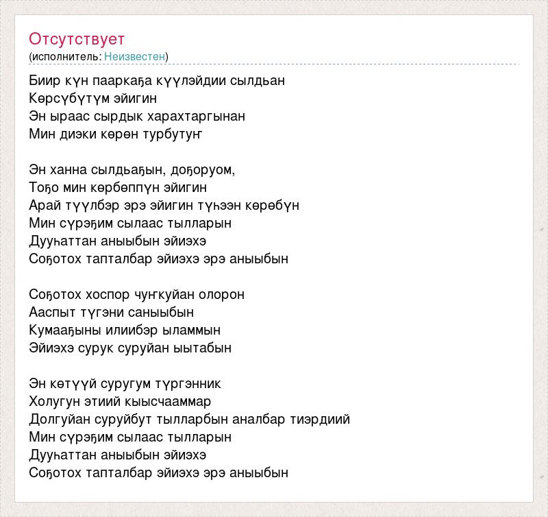 Биир күн пааркаҕа күүлэйдии сылдьан Көрсүбүтүм эйигин Эн ыраас сырдык харахтаргынан Мин диэки көрөн турбутуҥ Эн ханна сылдьаҕын, доҕоруом, Тоҕо мин көрбөппүн эйигин Арай түүлбэр эрэ эйигин түһээн көрөбүн Мин сүрэҕим сылаас тылларын Дууһаттан аныыбын эйиэхэ Соҕотох тапталбар эйиэхэ эрэ аныыбын Соҕотох хоспор чуҥкуйан олорон Ааспыт түгэни саныыбын Кумааҕыны илиибэр ыламмын Эйиэхэ сурук суруйан ыытабын Эн көтүүй суругум түргэнник Холугун этиий кыысчааммар Долгуйан суруйбут тылларбын аналбар тиэрдиий Мин сүрэҕим сылаас тылларын Дууһаттан аныыбын эйиэхэ Соҕотох тапталбар эйиэхэ эрэ аныыбын