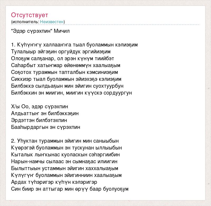 "Эдэр сүрэхпин" Мичил 1. Күhүҥҥү халлааҥҥа тыал буоламмын кэлиэҕим Тулалыыр эйгэҕин оргуйдук эргийиэҕим Олоҕум салҕанар, ол эрэн күнүм тиийбэт Саhарбыт хатыҥмар өйөнөммүн хаалыаҕым Соҕотох тураммын тапталбын кэмсиниэҕим Сиккиэр тыал буоламмын эйиэхэҕэ кэлиэҕим Билбэккэ сылдьаҕын мин эйигин суохтуурбун Билбэккин эн миигин, миигин күүскэ сордуургун Х/ы Оо, эдэр сүрэхпин Алдьаттыҥ эн билбэккэҕин Эрдэттэн билбэтэхпин Бааhырдаргын эн сүрэхпин 2. Уhуктан тураммын эйигин мин саныыбын Күөрэгэй буоламмын эн тускунан ыллыыбын Кыталык лыҥкынас куоласкын сэhэргиибин Нарын-намчы сылаас эн сымнаҕас илиигин Былыттыын устаммын эйигин хаххалыаҕым Күлүгүҥ буоламмын эйигинниин хаалыаҕым Ардах түhэригэр күhүн кэлэригэр Син биир эн аттыгар мин өрүү баар буолуоҕум