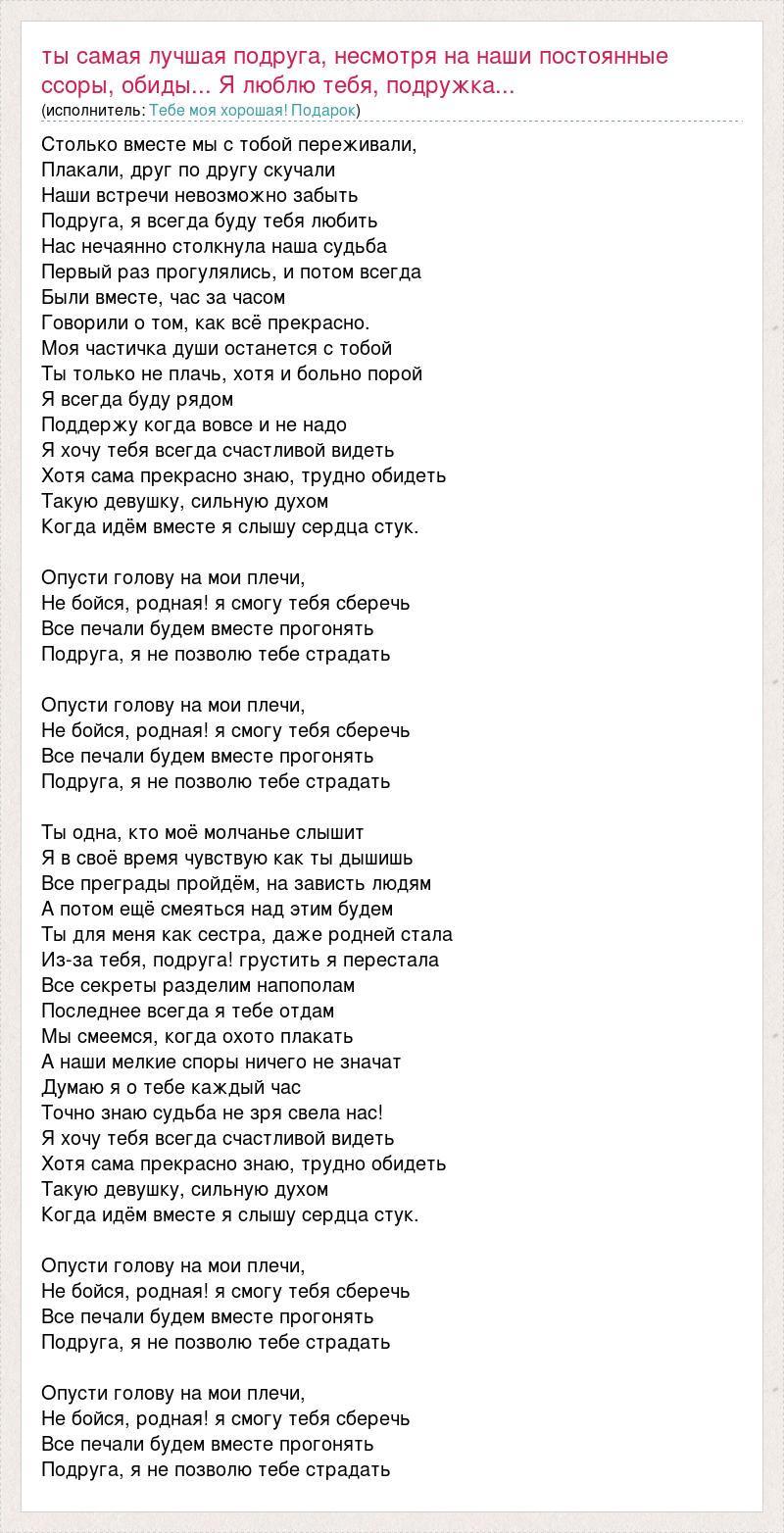 Столько вместе мы с тобой переживали, Плакали, друг по другу скучали Наши встречи невозможно забыть Подруга, я всегда буду тебя любить Нас нечаянно столкнула наша судьба Первый раз прогулялись, и потом всегда Были вместе, час за часом Говорили о том, как всё прекрасно. Моя частичка души останется с тобой Ты только не плачь, хотя и больно порой Я всегда буду рядом Поддержу когда вовсе и не надо Я хочу тебя всегда счастливой видеть Хотя сама прекрасно знаю, трудно обидеть Такую девушку, сильную духом Когда идём вместе я слышу сердца стук. Опусти голову на мои плечи, Не бойся, родная! я смогу тебя сберечь Все печали будем вместе прогонять Подруга, я не позволю тебе страдать Опусти голову на мои плечи, Не бойся, родная! я смогу тебя сберечь Все печали будем вместе прогонять Подруга, я не позволю тебе страдать Ты одна, кто моё молчанье слышит Я в своё время чувствую как ты дышишь Все преграды пройдём, на зависть людям А потом ещё смеяться над этим будем Ты для меня как сестра, даже родней стала Из-за тебя, подруга! грустить я перестала Все секреты разделим напополам Последнее всегда я тебе отдам Мы смеемся, когда охото плакать А наши мелкие споры ничего не значат Думаю я о тебе каждый час Точно знаю судьба не зря свела нас! Я хочу тебя всегда счастливой видеть Хотя сама прекрасно знаю, трудно обидеть Такую девушку, сильную духом Когда идём вместе я слышу сердца стук. Опусти голову на мои плечи, Не бойся, родная! я смогу тебя сберечь Все печали будем вместе прогонять Подруга, я не позволю тебе страдать Опусти голову на мои плечи, Не бойся, родная! я смогу тебя сберечь Все печали будем вместе прогонять Подруга, я не позволю тебе страдать