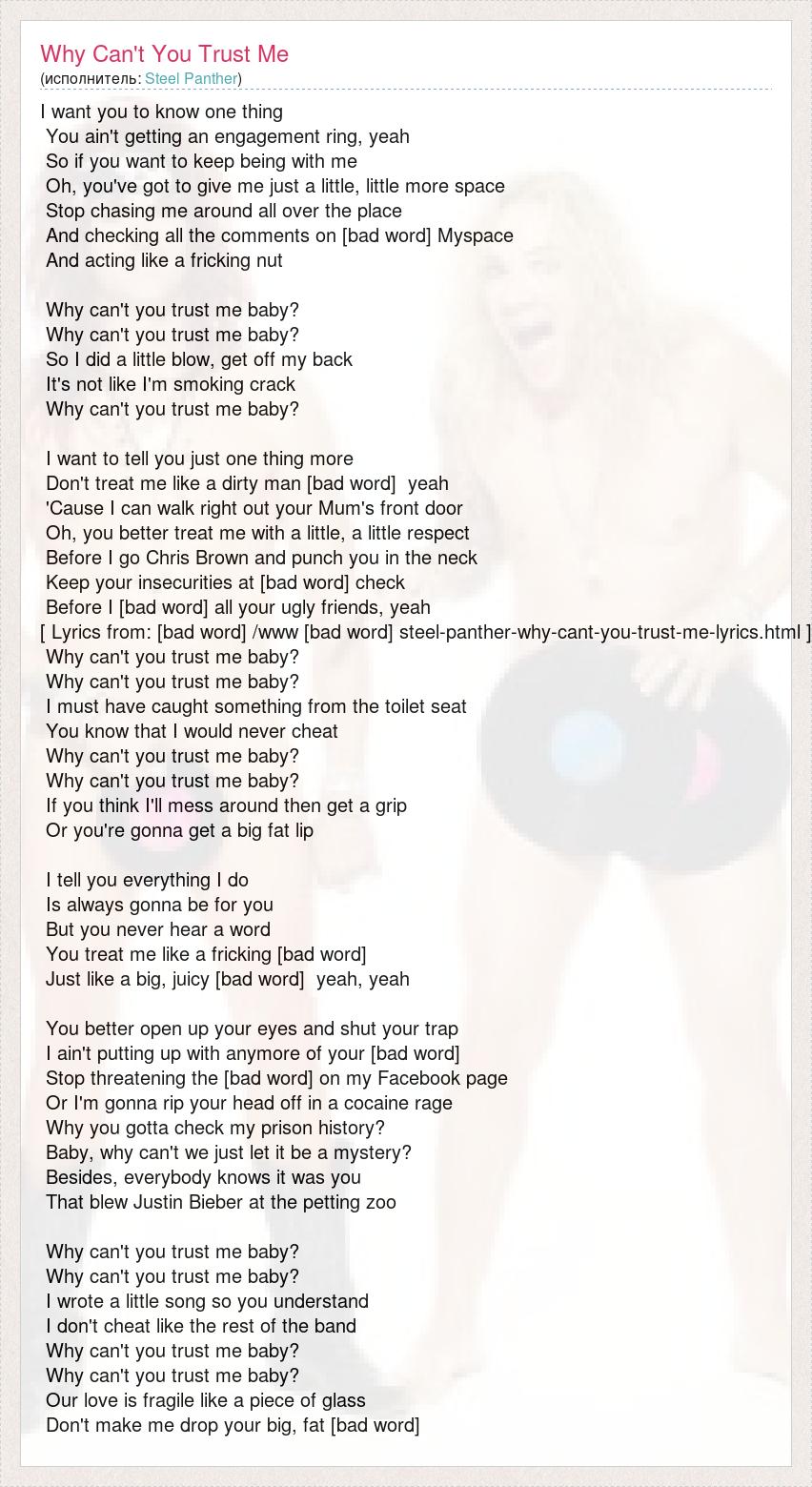 I want you to know one thing You ain't getting an engagement ring, yeah So if you want to keep being with me Oh, you've got to give me just a little, little more space Stop chasing me around all over the place And checking all the comments on [bad word] Myspace And acting like a fricking nut Why can't you trust me baby? Why can't you trust me baby? So I did a little blow, get off my back It's not like I'm smoking crack Why can't you trust me baby? I want to tell you just one thing more Don't treat me like a dirty man [bad word] yeah 'Cause I can walk right out your Mum's front door Oh, you better treat me with a little, a little respect Before I go Chris Brown and punch you in the neck Keep your insecurities at [bad word] check Before I [bad word] all your ugly friends, yeah [ Lyrics from: [bad word] /www [bad word] steel-panther-why-cant-you-trust-me-lyrics.html ] Why can't you trust me baby? Why can't you trust me baby? I must have caught something from the toilet seat You know that I would never cheat Why can't you trust me baby? Why can't you trust me baby? If you think I'll mess around then get a grip Or you're gonna get a big fat lip I tell you everything I do Is always gonna be for you But you never hear a word You treat me like a fricking [bad word] Just like a big, juicy [bad word] yeah, yeah You better open up your eyes and shut your trap I ain't putting up with anymore of your [bad word] Stop threatening the [bad word] on my Facebook page Or I'm gonna rip your head off in a cocaine rage Why you gotta check my prison history? Baby, why can't we just let it be a mystery? Besides, everybody knows it was you That blew Justin Bieber at the petting zoo Why can't you trust me baby? Why can't you trust me baby? I wrote a little song so you understand I don't cheat like the rest of the band Why can't you trust me baby? Why can't you trust me baby? Our love is fragile like a piece of glass Don't make me drop your big, fat [bad word]