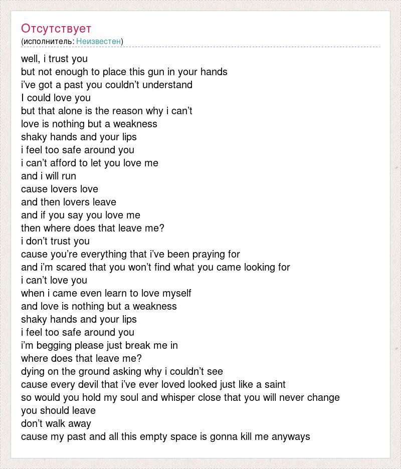 well, i trust you but not enough to place this gun in your hands i’ve got a past you couldn’t understand I could love you but that alone is the reason why i can’t love is nothing but a weakness shaky hands and your lips i feel too safe around you i can’t afford to let you love me and i will run cause lovers love and then lovers leave and if you say you love me then where does that leave me? i don’t trust you cause you’re everything that i’ve been praying for and i’m scared that you won’t find what you came looking for i can’t love you when i came even learn to love myself and love is nothing but a weakness shaky hands and your lips i feel too safe around you i’m begging please just break me in where does that leave me? dying on the ground asking why i couldn’t see cause every devil that i’ve ever loved looked just like a saint so would you hold my soul and whisper close that you will never change you should leave don’t walk away cause my past and all this empty space is gonna kill me anyways