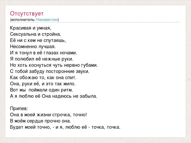 Красивая и умная, Сексуальна и стройна. Её ни с кем не спутаешь, Несомненно лучшая. И я тонул в её глазах ночами. Я полюбил её нежные руки. Но хоть коснуться чуть нервно губами. С тобой забуду посторонние звуки. Как обожаю то, как она спит. Она, руки её, и это так мило. Вот мы поймали один ритм. А я люблю её Она надеюсь не забыла. Припев: Она в моей жизни строчка, точно! В моём сердце прочно она. Будет моей точно, - и я, люблю её - точка, точка.