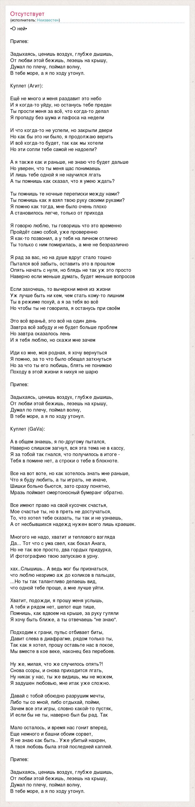 •О ней• Припев: Задыхаясь, ценишь воздух, глубже дышишь, От любви этой бежишь, лезешь на крышу, Думал по плечу, поймал волну, В тебе море, а я по ходу утонул. Куплет (Агит): Ещё не много и меня раздавит это небо И я когда-то уйду, но останусь тебе предан Ты прости меня за всё, что когда-то делал Я пропаду без шума и пафоса на недели И что когда-то не успели, но закрыли двери Но как бы это ни было, я продолжаю верить И всё когда-то будет, так как мы хотели Но эти сопли тебе самой не надоели? А я также как и раньше, не знаю что будет дальше Но уверен, что ты меня щас понимаешь И лишь тебе одной я не научился лгать А ты помнишь как сказал, что я умею ждать? Ты помнишь те ночные переписки между нами? Ты помнишь как я взял твою руку своими руками? Я помню как тогда, мне было очень плохо А становилось легче, только от прихода Я говорю люблю, ты говоришь что это временно Пройдёт само собой, уже проверенно Я как-то позвонил, а у тебя на личном отлично Ты только с ним помирилась, а мне не безразлично Я рад за вас, но на душе вдруг стало тошно Пытался всё забыть, оставить это в прошлом Опять начать с нуля, но блядь не так уж это просто Наверно если меньше думать, будет меньше вопросов Если захочешь, то вычеркни меня из жизни Уж лучше быть ни кем, чем стать кому-то лишним Ты в режиме похуй, а я за тебя во всё Но чтобы ты не говорила, я останусь при своём Это всё враньё, это всё на один день Завтра всё забуду и не будет больше проблем Но завтра оказалось лень И я тебя люблю, но скажи мне зачем Иди ко мне, моя родная, я хочу вернуться Я помню, за то что было обещал заткнуться Но за что ты его любишь, блять не понимаю Походу в этой жизни я нихуя не шарю Припев: Задыхаясь, ценишь воздух, глубже дышишь, От любви этой бежишь, лезешь на крышу, Думал по плечу, поймал волну, В тебе море, а я по ходу утонул. Куплет (GaVa): А в общем знаешь, я по-другому пытался, Наверно слишком загнул, вся эта тема не в кассу, Я за тобой так гнался, что получилось в итоге - Тебя в помине нет, а строки о тебе в блокноте. Все на вот воте, но как хотелось знать мне раньше, Что я буду любить, а ты играть, не иначе, Шишки больно бьются, зато сразу понятно, Мразь поймает смертоносный бумеранг обратно. Все имеют право на свой кусочек счастья, Мое счастье ты, но в преть не достучаться, То, что хотел тебе сказать, ты так и не узнаешь, А от несбывшихся надежд нужен всего лишь краешек. Многого не надо, хватит и теплового взгляда Да... Тот что с ума свел, как бокал Анага, Но не так все просто, два гордых придурка, И фотографию твою запускаю в урну. хах..Слышишь.. А ведь мог бы признаться, что люблю незримо аж до коликов в пальцах, ...Но ты так талантливо делаешь вид, что одной тебе проще, а мне лучше уйти. Хватит, подожди, я прошу меня услышь, А тебя и рядом нет, шепот еще тише, Помнишь, как вдвоем на крыше, за руку гуляли Я хочу быть ближе, а ты отвечаешь "не знаю". Подходим к грани, пульс отбивает биты, Давит слева в диафрагме, рядом только ты, Так как я хотел, прошу оставьте нас в покое, Мы вместе в кое веке, наконец без перебоев. Ну же, милая, что же случилось опять?! Снова ссоры, и снова приходится лгать, Ну никак у нас, ты же видишь, мы не можем, Я задушен любовью, мне итак уже сложно. Давай с тобой обоюдно разрушим мечты, Либо ты со мной, либо отдыхай, пойми, Зачем все эти игры, словно какой-то пустяк, И если бы не ты, наверно был бы рад. Так Мало осталось, и время нас го