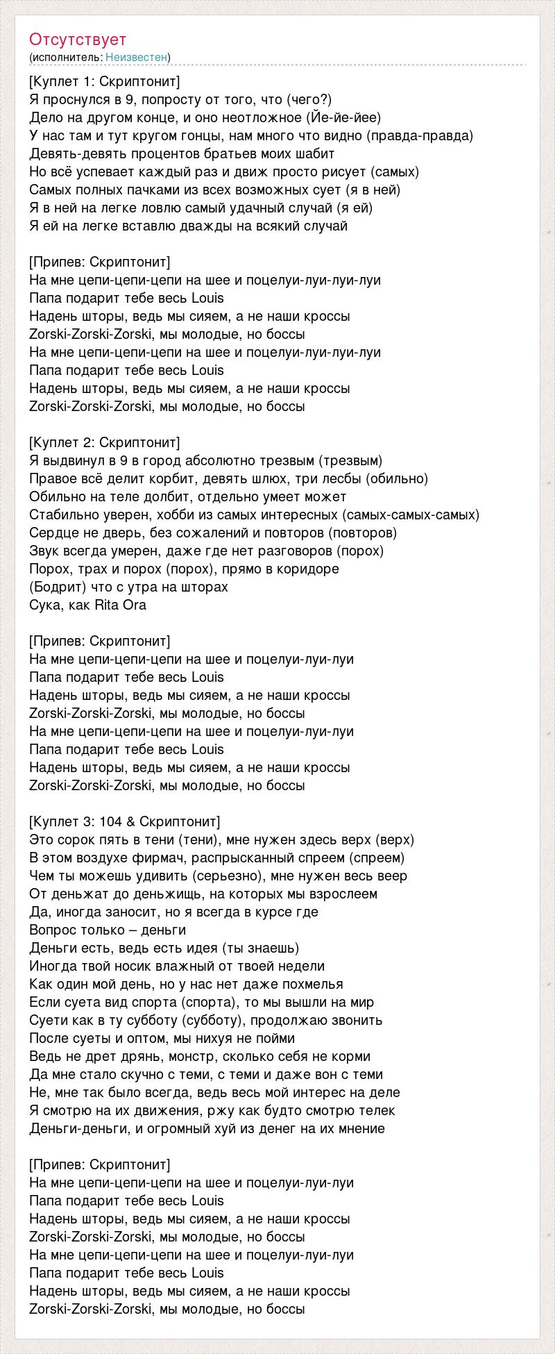 [Куплет 1: Скриптонит] Я проснулся в 9, попросту от того, что (чего?) Дело на другом конце, и оно неотложное (Йе-йе-йее) У нас там и тут кругом гонцы, нам много что видно (правда-правда) Девять-девять процентов братьев моих шабит Но всё успевает каждый раз и движ просто рисует (самых) Самых полных пачками из всех возможных сует (я в ней) Я в ней на легке ловлю самый удачный случай (я ей) Я ей на легке вставлю дважды на всякий случай [Припев: Скриптонит] На мне цепи-цепи-цепи на шее и поцелуи-луи-луи-луи Папа подарит тебе весь Louis Надень шторы, ведь мы сияем, а не наши кроссы Zorski-Zorski-Zorski, мы молодые, но боссы На мне цепи-цепи-цепи на шее и поцелуи-луи-луи-луи Папа подарит тебе весь Louis Надень шторы, ведь мы сияем, а не наши кроссы Zorski-Zorski-Zorski, мы молодые, но боссы [Куплет 2: Скриптонит] Я выдвинул в 9 в город абсолютно трезвым (трезвым) Правое всё делит корбит, девять шлюх, три лесбы (обильно) Обильно на теле долбит, отдельно умеет может Стабильно уверен, хобби из самых интересных (самых-самых-самых) Сердце не дверь, без сожалений и повторов (повторов) Звук всегда умерен, даже где нет разговоров (порох) Порох, трах и порох (порох), прямо в коридоре (Бодрит) что с утра на шторах Сука, как Rita Ora [Припев: Скриптонит] На мне цепи-цепи-цепи на шее и поцелуи-луи-луи Папа подарит тебе весь Louis Надень шторы, ведь мы сияем, а не наши кроссы Zorski-Zorski-Zorski, мы молодые, но боссы На мне цепи-цепи-цепи на шее и поцелуи-луи-луи Папа подарит тебе весь Louis Надень шторы, ведь мы сияем, а не наши кроссы Zorski-Zorski-Zorski, мы молодые, но боссы [Куплет 3: 104 & Скриптонит] Это сорок пять в тени (тени), мне нужен здесь верх (верх) В этом воздухе фирмач, распрысканный спреем (спреем) Чем ты можешь удивить (серьезно), мне нужен весь веер От деньжат до деньжищь, на которых мы взрослеем Да, иногда заносит, но я всегда в курсе где Вопрос только – деньги Деньги есть, ведь есть идея (ты знаешь) Иногда твой носик влажный от твоей недели Как один мой день, но у нас нет даже похмелья Если суета вид спорта (спорта), то мы вышли на мир Суети как в ту субботу (субботу), продолжаю звонить После суеты и оптом, мы нихуя не пойми Ведь не дрет дрянь, монстр, сколько себя не корми Да мне стало скучно с теми, с теми и даже вон с теми Не, мне так было всегда, ведь весь мой интерес на деле Я смотрю на их движения, ржу как будто смотрю телек Деньги-деньги, и огромный хуй из денег на их мнение [Припев: Скриптонит] На мне цепи-цепи-цепи на шее и поцелуи-луи-луи Папа подарит тебе весь Louis Надень шторы, ведь мы сияем, а не наши кроссы Zorski-Zorski-Zorski, мы молодые, но боссы На мне цепи-цепи-цепи на шее и поцелуи-луи-луи Папа подарит тебе весь Louis Надень шторы, ведь мы сияем, а не наши кроссы Zorski-Zorski-Zorski, мы молодые, но боссы