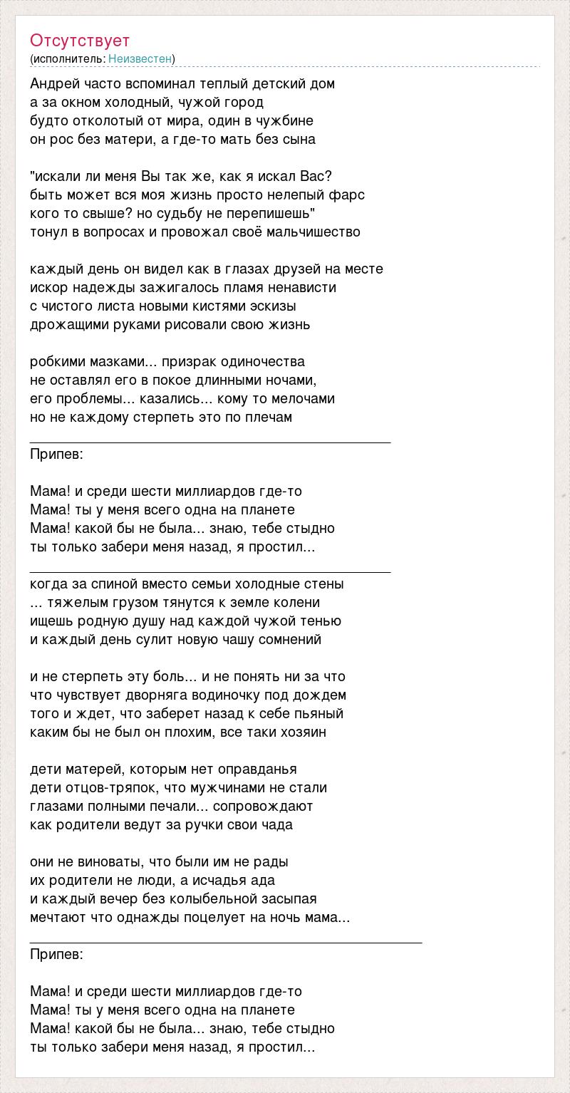 Андрей часто вспоминал теплый детский дом а за окном холодный, чужой город будто отколотый от мира, один в чужбине он рос без матери, а где-то мать без сына "искали ли меня Вы так же, как я искал Вас? быть может вся моя жизнь просто нелепый фарс кого то свыше? но судьбу не перепишешь" тонул в вопросах и провожал своё мальчишество каждый день он видел как в глазах друзей на месте искор надежды зажигалось пламя ненависти с чистого листа новыми кистями эскизы дрожащими руками рисовали свою жизнь робкими мазками... призрак одиночества не оставлял его в покое длинными ночами, его проблемы... казались... кому то мелочами но не каждому стерпеть это по плечам ______________________________________________ Припев: Мама! и среди шести миллиардов где-то Мама! ты у меня всего одна на планете Мама! какой бы не была... знаю, тебе стыдно ты только забери меня назад, я простил... ______________________________________________ когда за спиной вместо семьи холодные стены ... тяжелым грузом тянутся к земле колени ищешь родную душу над каждой чужой тенью и каждый день сулит новую чашу сомнений и не стерпеть эту боль... и не понять ни за что что чувствует дворняга водиночку под дождем того и ждет, что заберет назад к себе пьяный каким бы не был он плохим, все таки хозяин дети матерей, которым нет оправданья дети отцов-тряпок, что мужчинами не стали глазами полными печали... сопровождают как родители ведут за ручки свои чада они не виноваты, что были им не рады их родители не люди, а исчадья ада и каждый вечер без колыбельной засыпая мечтают что однажды поцелует на ночь мама... __________________________________________________ Припев: Мама! и среди шести миллиардов где-то Мама! ты у меня всего одна на планете Мама! какой бы не была... знаю, тебе стыдно ты только забери меня назад, я простил...