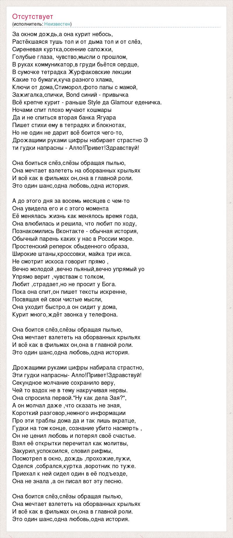 За окном дождь,а она курит небось, Растёкшаяся тушь тол и от дыма тол и от слёз, Сиреневая куртка,осенние сапожки, Голубые глаза, чувство,мысли о прошлом, В руках коммуникатор,в груди бьётся сердце, В сумочке тетрадка Журфаковские лекции Какие то бумаги,куча разного хлама, Ключи от дома,Стиморол,фото папы с мамой, Зажигалка,спички, Bond синий - привычка Всё крепче курит - раньше Style да Glamour еденичка. Ночами спит плохо мучают кошмары Да и не спиться вторая банка Ягуара Пишет стихи ему в тетрадях и блокнотах, Но не один не дарит всё боится чего-то, Дрожащими руками цифры набирает страстно Э ти гудки напрасны - Алло!Привет!Здравствуй! Она боиться слёз,слёзы обращая пылью, Она мечтает взлететь на оборванных крыльях И всё как в фильмах он,она в главной роли. Это один шанс,одна любовь,одна история. А до этого дня за восемь месяцев с чем-то Она увидела его и с этого момента Её менялась жизнь как менялось время года, Она влюбилась и решила, что любит по ходу, Познакомились Вконтакте - обычная история, Обычный парень каких у нас в России море. Простенский реперок обыденного образа, Широкие штаны,кроссовки, майка три икса. Не смотрит искоса говорит прямо , Вечно молодой ,вечно пьяный,вечно упрямый yo Упрямо верит ,чувствам с толком, Любит ,страдает,но не просит у Бога. Пока она спит,он пишет тексты искренне, Посвящая ей свои чистые мысли, Она уходит быстро,а он сидит у дома, Курит много,ждёт звонка у телефона. Она боится слёз,слёзы обращая пылью, Она мечтает взлететь на оборванных крыльях И всё как в фильмах он,она в главной роли. Это один шанс,одна любовь,одна история. Дрожащими руками цифры набирала страстно, Эти гудки напрасны- Алло!Привет!Здравствуй! Секундное молчание сохранило веру, Чей то вздох не в тему накручивая нервы. Она спросила первой."Ну как дела Зая?", А он молчал даже ,что сказать не зная, Короткий разговор,немного информации Про эти траблы дома да и так лишь вкратце, Гудки на том конце, сознание убито насмерть , Он не ценил любовь и потерял своё счастье. Взял её открытки перечитал как молитвы, Закурил,успокоился, словил рифмы, Посмотрел в окно, дождь ,прохожие,лужи, Оделся ,собрался,куртка ,воротник по туже. Приехал к ней сидел один в её подъезде, Она не знала ,а он писал вот эту песню. Она боится слёз,слёзы обращая пылью, Она мечтает взлететь на оборванных крыльях И всё как в фильмах он,она в главной роли. Это один шанс,одна любовь,одна история.