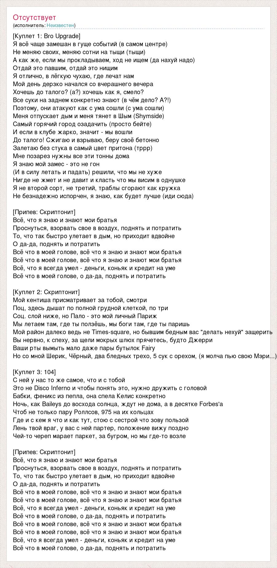 [Куплет 1: Bro Upgrade] Я всё чаще замешан в гуще событий (в самом центре) Не меняю своих, меняю сотни на тыщи (тыщи) А как же, если мы прокладываем, ход не ищем (да нахуй надо) Отдай это павшим, отдай это нищим Я отлично, в лёгкую чухаю, где лечат нам Мой день дерзко начался со вчерашнего вечера Хочешь до талого? (а?) хочешь как я, смело? Все суки на заднем конкретно знают (в чём дело? А?!) Поэтому, они атакуют как с ума сошли (с ума сошли) Меня отпускает дым и меня тянет в Шым (Shymside) Самый горячий город озадачить (просто бейте) И если в клубе жарко, значит - мы вошли До талого! Сжигаю и взрываю, беру своё бетонно Залетаю без стука в самый цвет притона (тррр) Мне позарез нужны все эти тонны дома Я знаю мой замес - это не гон (И в силу летать и падать) решили, что мы не хуже Нигде не жмет и не давит и класть что мы висим в однушке Я не второй сорт, не третий, траблы сгорают как кружка Не безнадежно испорчен, я знаю, как будет лучше (иди сюда) [Припев: Скриптонит] Всё, что я знаю и знают мои братья Проснуться, взорвать свое в воздух, поднять и потратить То, что так быстро улетает в дым, но приходит вдвойне О да-да, поднять и потратить Всё что в моей голове, всё что я знаю и знают мои братья Всё что в моей голове, всё что я знаю и знают мои братья Всё, что я всегда умел - деньги, коньяк и кредит на уме Всё что в моей голове, о да-да, поднять и потратить [Куплет 2: Скриптонит] Мой кентиша присматривает за тобой, смотри Поц, здесь дышат по полной грудной клеткой, по три Соц. слой ниже, но Пало - это мой личный Париж Мы летаем там, где ты ползёшь, мы боги там, где ты паришь Мой район далеко ведь не Times-square, но бывшим бедным вас "делать нехуй" защерить Вы нервно, к спеху, за щели мокрых шлюх прячетесь, будто Джерри Ваши рты вымыть мало даже пары бутылок Fairy Но со мной Шерик, Чёрный, два бледных трехо, 5 сук с орехом, (я молча пью свою Мэри...) [Куплет 3: 104] С ней у нас то же самое, что и с тобой Это не Disco Inferno и чтобы понять это, нужно дружить с головой Бабки, феникс из пепла, она спела Келис конкретно Ночь, как Baileys до восхода солнца, ждут не дома, а в десятке Forbes'а Чтоб не только пару Роллсов, 975 на их кольцах Где и с кем я что и как тут, стою с сестрой что зову пользой Лень твой враг, у вас с ней партер, положение вижу поздно Чей-то череп марает паркет, за бугром, но мы где-то возле [Припев: Скриптонит] Всё, что я знаю и знают мои братья Проснуться, взорвать свое в воздух, поднять и потратить То, что так быстро улетает в дым, но приходит вдвойне О да-да, поднять и потратить Всё что в моей голове, всё что я знаю и знают мои братья Всё что в моей голове, всё что я знаю и знают мои братья Всё, что я всегда умел - деньги, коньяк и кредит на уме Всё что в моей голове, о да-да, поднять и потратить Всё что в моей голове, всё что я знаю и знают мои братья Всё что в моей голове, всё что я знаю и знают мои братья Всё, что я всегда умел - деньги, коньяк и кредит на уме Всё что в моей голове, о да-да, поднять и потратить