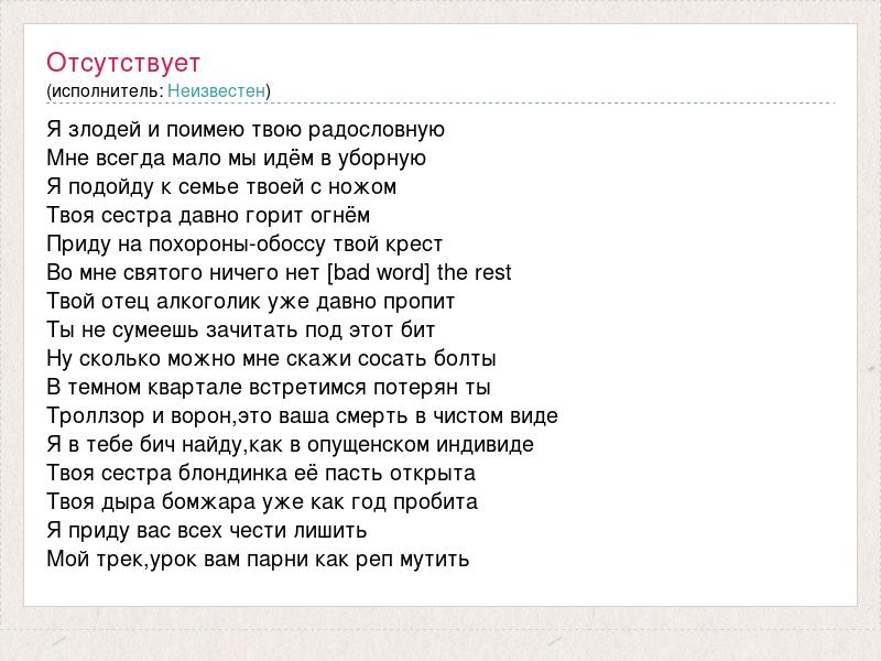 Я злодей и поимею твою радословную Мне всегда мало мы идём в уборную Я подойду к семье твоей с ножом Твоя сестра давно горит огнём Приду на похороны-обоссу твой крест Во мне святого ничего нет [bad word] the rest Твой отец алкоголик уже давно пропит Ты не сумеешь зачитать под этот бит Ну сколько можно мне скажи сосать болты В темном квартале встретимся потерян ты Троллзор и ворон,это ваша смерть в чистом виде Я в тебе бич найду,как в опущенском индивиде Твоя сестра блондинка её пасть открыта Твоя дыра бомжара уже как год пробита Я приду вас всех чести лишить Мой трек,урок вам парни как реп мутить