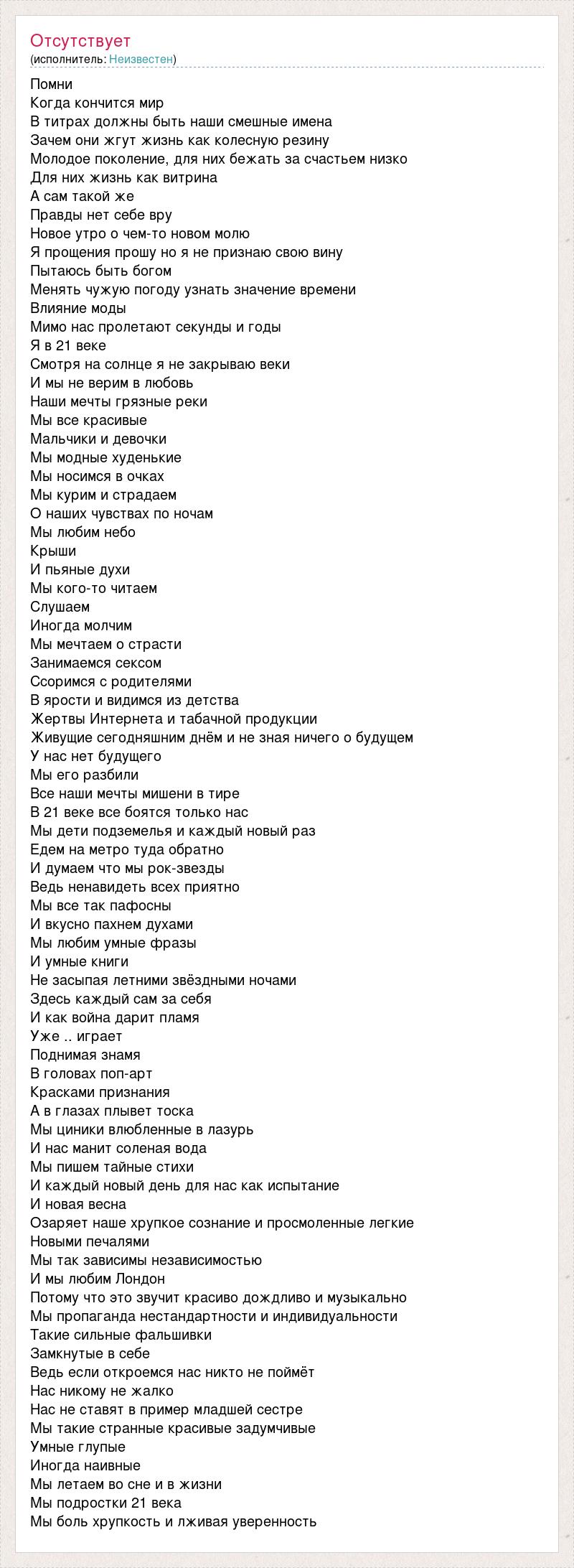 Помни Когда кончится мир В титрах должны быть наши смешные имена Зачем они жгут жизнь как колесную резину Молодое поколение, для них бежать за счастьем низко Для них жизнь как витрина А сам такой же Правды нет себе вру Новое утро о чем-то новом молю Я прощения прошу но я не признаю свою вину Пытаюсь быть богом Менять чужую погоду узнать значение времени Влияние моды Мимо нас пролетают секунды и годы Я в 21 веке Смотря на солнце я не закрываю веки И мы не верим в любовь Наши мечты грязные реки Мы все красивые Мальчики и девочки Мы модные худенькие Мы носимся в очках Мы курим и страдаем О наших чувствах по ночам Мы любим небо Крыши И пьяные духи Мы кого-то читаем Слушаем Иногда молчим Мы мечтаем о страсти Занимаемся сексом Ссоримся с родителями В ярости и видимся из детства Жертвы Интернета и табачной продукции Живущие сегодняшним днём и не зная ничего о будущем У нас нет будущего Мы его разбили Все наши мечты мишени в тире В 21 веке все боятся только нас Мы дети подземелья и каждый новый раз Едем на метро туда обратно И думаем что мы рок-звезды Ведь ненавидеть всех приятно Мы все так пафосны И вкусно пахнем духами Мы любим умные фразы И умные книги Не засыпая летними звёздными ночами Здесь каждый сам за себя И как война дарит пламя Уже .. играет Поднимая знамя В головах поп-арт Красками признания А в глазах плывет тоска Мы циники влюбленные в лазурь И нас манит соленая вода Мы пишем тайные стихи И каждый новый день для нас как испытание И новая весна Озаряет наше хрупкое сознание и просмоленные легкие Новыми печалями Мы так зависимы независимостью И мы любим Лондон Потому что это звучит красиво дождливо и музыкально Мы пропаганда нестандартности и индивидуальности Такие сильные фальшивки Замкнутые в себе Ведь если откроемся нас никто не поймёт Нас никому не жалко Нас не ставят в пример младшей сестре Мы такие странные красивые задумчивые Умные глупые Иногда наивные Мы летаем во сне и в жизни Мы подростки 21 века Мы боль хрупкость и лживая уверенность
