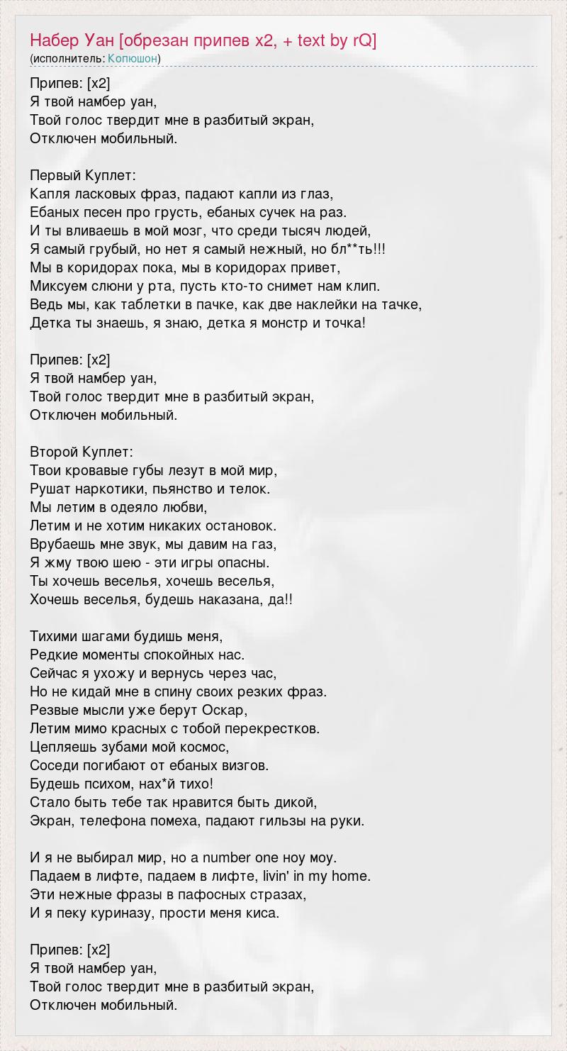 Припев: [х2] Я твой намбер уан, Твой голос твердит мне в разбитый экран, Отключен мобильный. Первый Куплет: Капля ласковых фраз, падают капли из глаз, Ебаных песен про грусть, ебаных сучек на раз. И ты вливаешь в мой мозг, что среди тысяч людей, Я самый грубый, но нет я самый нежный, но бл**ть!!! Мы в коридорах пока, мы в коридорах привет, Миксуем слюни у рта, пусть кто-то снимет нам клип. Ведь мы, как таблетки в пачке, как две наклейки на тачке, Детка ты знаешь, я знаю, детка я монстр и точка! Припев: [х2] Я твой намбер уан, Твой голос твердит мне в разбитый экран, Отключен мобильный. Второй Куплет: Твои кровавые губы лезут в мой мир, Рушат наркотики, пьянство и телок. Мы летим в одеяло любви, Летим и не хотим никаких остановок. Врубаешь мне звук, мы давим на газ, Я жму твою шею - эти игры опасны. Ты хочешь веселья, хочешь веселья, Хочешь веселья, будешь наказана, да!! Тихими шагами будишь меня, Редкие моменты спокойных нас. Сейчас я ухожу и вернусь через час, Но не кидай мне в спину своих резких фраз. Резвые мысли уже берут Оскар, Летим мимо красных с тобой перекрестков. Цепляешь зубами мой космос, Соседи погибают от ебаных визгов. Будешь психом, нах*й тихо! Стало быть тебе так нравится быть дикой, Экран, телефона помеха, падают гильзы на руки. И я не выбирал мир, но a number one ноу моу. Падаем в лифте, падаем в лифте, livin' in my home. Эти нежные фразы в пафосных стразах, И я пеку куриназу, прости меня киса. Припев: [х2] Я твой намбер уан, Твой голос твердит мне в разбитый экран, Отключен мобильный.