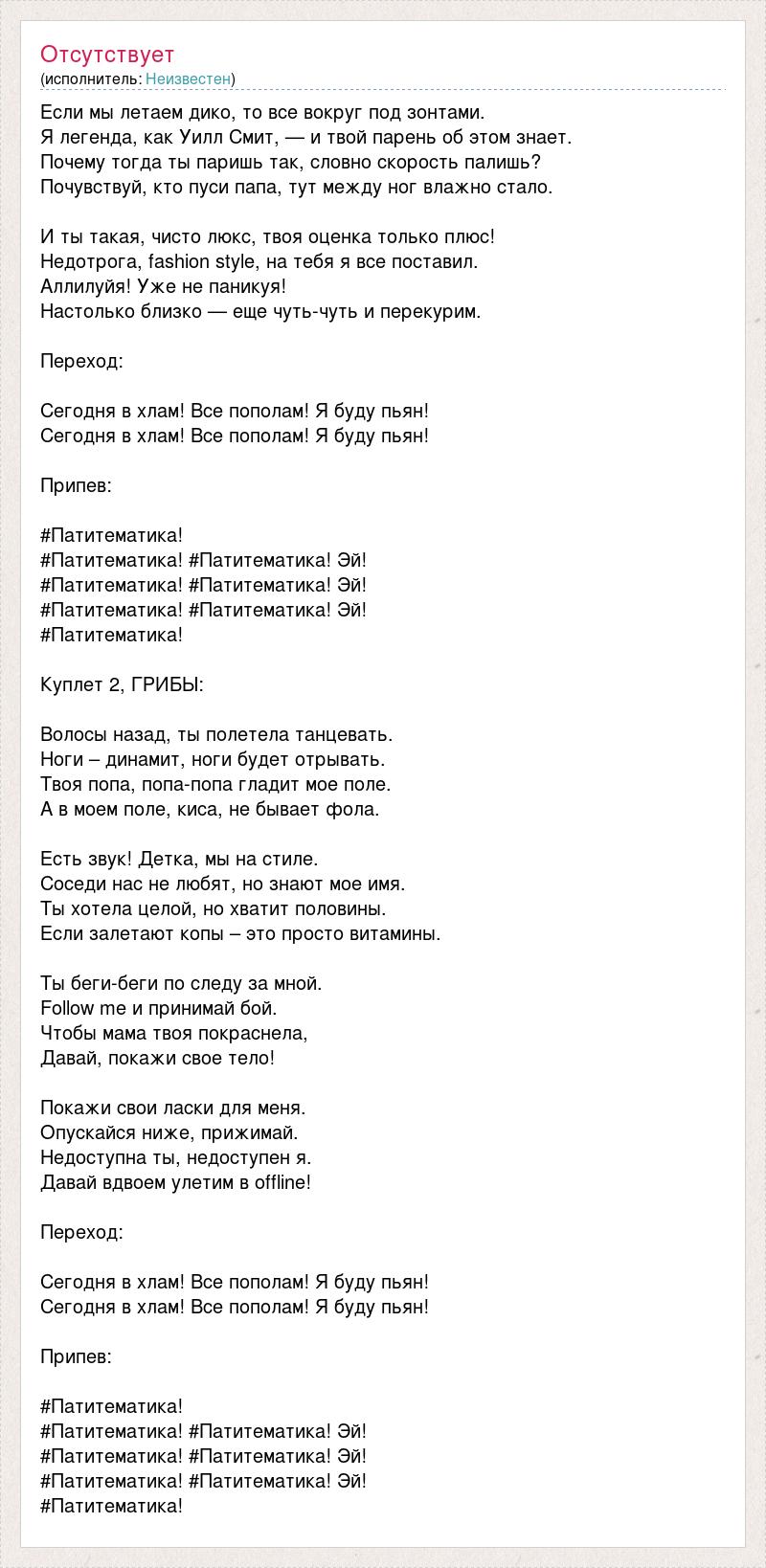 Если мы летаем дико, то все вокруг под зонтами. Я легенда, как Уилл Смит, — и твой парень об этом знает. Почему тогда ты паришь так, словно скорость палишь? Почувствуй, кто пуси папа, тут между ног влажно стало. И ты такая, чисто люкс, твоя оценка только плюс! Недотрога, fashion style, на тебя я все поставил. Аллилуйя! Уже не паникуя! Настолько близко — еще чуть-чуть и перекурим. Переход: Сегодня в хлам! Все пополам! Я буду пьян! Сегодня в хлам! Все пополам! Я буду пьян! Припев: #Патитематика! #Патитематика! #Патитематика! Эй! #Патитематика! #Патитематика! Эй! #Патитематика! #Патитематика! Эй! #Патитематика! Куплет 2, ГРИБЫ: Волосы назад, ты полетела танцевать. Ноги – динамит, ноги будет отрывать. Твоя попа, попа-попа гладит мое поле. А в моем поле, киса, не бывает фола. Есть звук! Детка, мы на стиле. Соседи нас не любят, но знают мое имя. Ты хотела целой, но хватит половины. Если залетают копы – это просто витамины. Ты беги-беги по следу за мной. Follow me и принимай бой. Чтобы мама твоя покраснела, Давай, покажи свое тело! Покажи свои ласки для меня. Опускайся ниже, прижимай. Недоступна ты, недоступен я. Давай вдвоем улетим в offline! Переход: Сегодня в хлам! Все пополам! Я буду пьян! Сегодня в хлам! Все пополам! Я буду пьян! Припев: #Патитематика! #Патитематика! #Патитематика! Эй! #Патитематика! #Патитематика! Эй! #Патитематика! #Патитематика! Эй! #Патитематика!