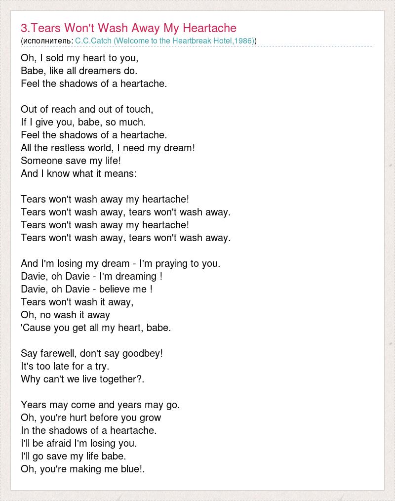 Oh, I sold my heart to you, Babe, like all dreamers do. Feel the shadows of a heartache. Out of reach and out of touch, If I give you, babe, so much. Feel the shadows of a heartache. All the restless world, I need my dream! Someone save my life! And I know what it means: Tears won't wash away my heartache! Tears won't wash away, tears won't wash away. Tears won't wash away my heartache! Tears won't wash away, tears won't wash away. And I'm losing my dream - I'm praying to you. Davie, oh Davie - I'm dreaming ! Davie, oh Davie - believe me ! Tears won't wash it away, Oh, no wash it away 'Cause you get all my heart, babe. Say farewell, don't say goodbey! It's too late for a try. Why can't we live together?. Years may come and years may go. Oh, you're hurt before you grow In the shadows of a heartache. I'll be afraid I'm losing you. I'll go save my life babe. Oh, you're making me blue!.