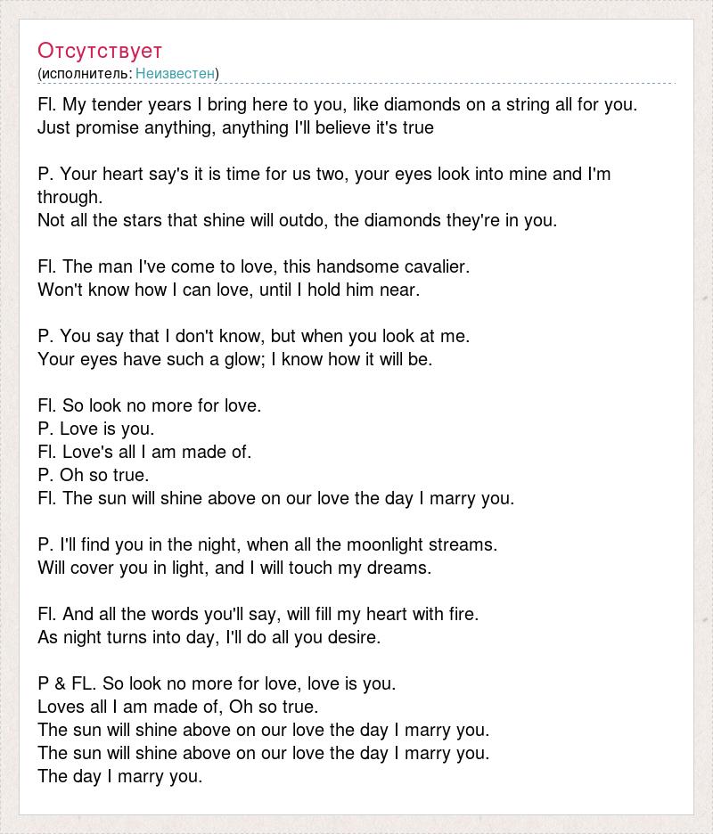 Fl. My tender years I bring here to you, like diamonds on a string all for you. Just promise anything, anything I'll believe it's true P. Your heart say's it is time for us two, your eyes look into mine and I'm through. Not all the stars that shine will outdo, the diamonds they're in you. Fl. The man I've come to love, this handsome cavalier. Won't know how I can love, until I hold him near. P. You say that I don't know, but when you look at me. Your eyes have such a glow; I know how it will be. Fl. So look no more for love. P. Love is you. Fl. Love's all I am made of. P. Oh so true. Fl. The sun will shine above on our love the day I marry you. P. I'll find you in the night, when all the moonlight streams. Will cover you in light, and I will touch my dreams. Fl. And all the words you'll say, will fill my heart with fire. As night turns into day, I'll do all you desire. P & FL. So look no more for love, love is you. Loves all I am made of, Oh so true. The sun will shine above on our love the day I marry you. The sun will shine above on our love the day I marry you. The day I marry you.