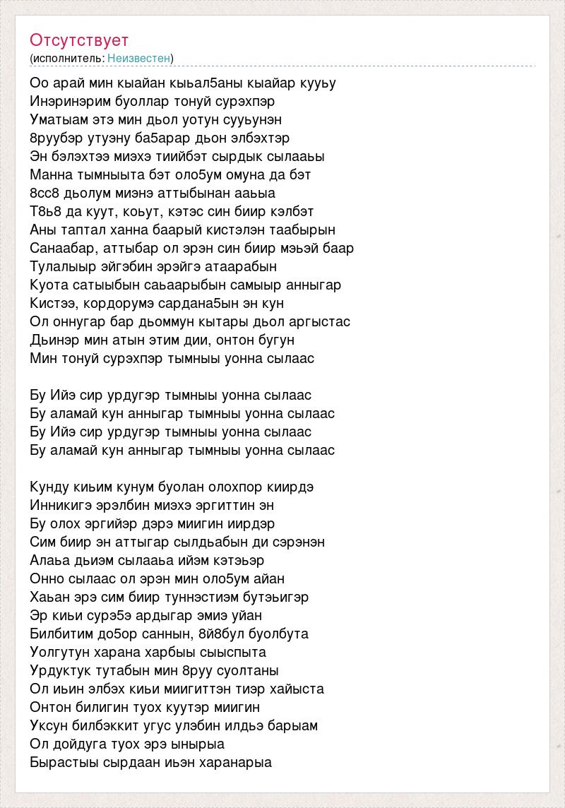Оо арай мин кыайан кыьал5аны кыайар кууьу Инэринэрим буоллар тонуй сурэхпэр Уматыам этэ мин дьол уотун сууьунэн 8руубэр утуэну ба5арар дьон элбэхтэр Эн бэлэхтээ миэхэ тиийбэт сырдык сылааьы Манна тымныыта бэт оло5ум омуна да бэт 8сс8 дьолум миэнэ аттыбынан ааьыа Т8ь8 да куут, коьут, кэтэс син биир кэлбэт Аны таптал ханна баарый кистэлэн таабырын Санаабар, аттыбар ол эрэн син биир мэьэй баар Тулалыыр эйгэбин эрэйгэ атаарабын Куота сатыыбын саьаарыбын самыыр анныгар Кистээ, кордорумэ сардана5ын эн кун Ол оннугар бар дьоммун кытары дьол аргыстас Дьинэр мин атын этим дии, онтон бугун Мин тонуй сурэхпэр тымныы уонна сылаас Бу Ийэ сир урдугэр тымныы уонна сылаас Бу аламай кун анныгар тымныы уонна сылаас Бу Ийэ сир урдугэр тымныы уонна сылаас Бу аламай кун анныгар тымныы уонна сылаас Кунду киьим кунум буолан олохпор киирдэ Инникигэ эрэлбин миэхэ эргиттин эн Бу олох эргийэр дэрэ миигин иирдэр Сим биир эн аттыгар сылдьабын ди сэрэнэн Алаьа дьиэм сылааьа ийэм кэтэьэр Онно сылаас ол эрэн мин оло5ум айан Хаьан эрэ сим биир туннэстиэм бутэьигэр Эр киьи сурэ5э ардыгар эмиэ уйан Билбитим до5ор саннын, 8й8бул буолбута Уолгутун харана харбыы сыыспыта Урдуктук тутабын мин 8руу суолтаны Ол иьин элбэх киьи миигиттэн тиэр хайыста Онтон билигин туох куутэр миигин Уксун билбэккит угус улэбин илдьэ барыам Ол дойдуга туох эрэ ынырыа Бырастыы сырдаан иьэн харанарыа