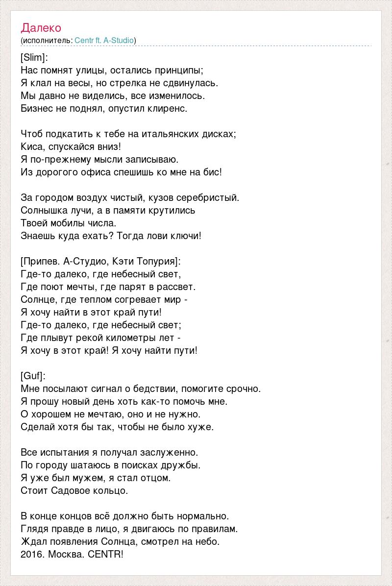[Slim]: Нас помнят улицы, остались принципы; Я клал на весы, но стрелка не сдвинулась. Мы давно не виделись, все изменилось. Бизнес не поднял, опустил клиренс. Чтоб подкатить к тебе на итальянских дисках; Киса, спускайся вниз! Я по-прежнему мысли записываю. Из дорогого офиса спешишь ко мне на бис! За городом воздух чистый, кузов серебристый. Солнышка лучи, а в памяти крутились Твоей мобилы числа. Знаешь куда ехать? Тогда лови ключи! [Припев. А-Студио, Кэти Топурия]: Где-то далеко, где небесный свет, Где поют мечты, где парят в рассвет. Солнце, где теплом согревает мир - Я хочу найти в этот край пути! Где-то далеко, где небесный свет; Где плывут рекой километры лет - Я хочу в этот край! Я хочу найти пути! [Guf]: Мне посылают сигнал о бедствии, помогите срочно. Я прошу новый день хоть как-то помочь мне. О хорошем не мечтаю, оно и не нужно. Сделай хотя бы так, чтобы не было хуже. Все испытания я получал заслуженно. По городу шатаюсь в поисках дружбы. Я уже был мужем, я стал отцом. Стоит Садовое кольцо. В конце концов всё должно быть нормально. Глядя правде в лицо, я двигаюсь по правилам. Ждал появления Солнца, смотрел на небо. 2016. Москва. CENTR!
