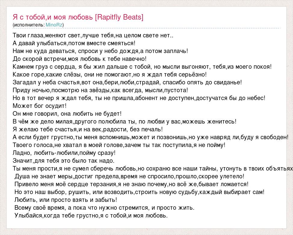 Твои глаза,меняют свет,лучше тебя,на целом свете нет.. А давай улыбаться,потом вместе смеяться! Нам не куда деваться, спроси у небо дождя,а потом заплачь! До скорой встречи,моя любовь к тебе навечно! Камнем груз с сердца, я бы жил дальше с тобой, но мысли выгоняют, тебя,из моего покоя! Какое горе,какие слёзы, они не помогают,но я ждал тебя серьёзно! Загадал у неба счастья,вот она,бери,люби,страдай, спасибо опять до свиданье! Приду ночью,посмотрю на звёзды,как всегда, мысли,пустота! Но в тот вечер я ждал тебя, ты не пришла,абонент не доступен,достучатся бы до небес! Может бог осудит! Он мне говорил, она любить не будет! В чём же дело милая,другого полюбила ты, по любви у вас,можешь женитесь! Я желаю тебе счастья,и на век,радости, без печаль! А если будет грустно,ты меня вспомнишь,может и позвонишь,но уже навряд ли,буду я свободен! Твоего голоса,не хватал в моей голове,зачем ты так поступила,я не пойму! Ладно, любить-любили,пойму сразу! Значит,для тебя это было так надо. Ты меня прости,я не сумел сберечь любовь,но сохраню все наши тайны, утонуть в твоих объятьях Душа не знает меры,достиг предела,время не спросило,прошло,скорее улетело! Привело меня моё сердце терзания,я не знаю почему,но всё же,бывает ломается! Но это наш выбор, рушить, или возводить,строить новую судьбу,каждый выбирает сам! Любить, или просто взять и забыть! Всему своё время, а пока что нужно стремится, и просто жить. Улыбайся,когда тебе грустно,я с тобой,и моя любовь.