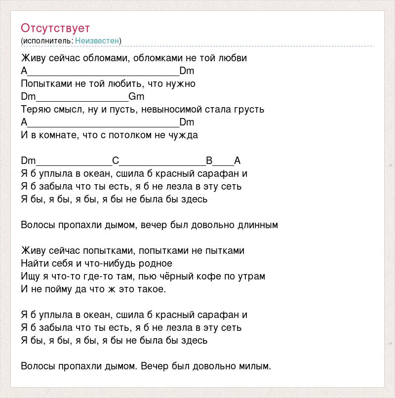 Живу сейчас обломами, обломками не той любви A____________________________Dm Попытками не той любить, что нужно Dm_________________Gm Теряю смысл, ну и пусть, невыносимой стала грусть A____________________________Dm И в комнате, что с потолком не чужда Dm______________C________________B____A Я б уплыла в океан, сшила б красный сарафан и Я б забыла что ты есть, я б не лезла в эту сеть Я бы, я бы, я бы, я бы не была бы здесь Волосы пропахли дымом, вечер был довольно длинным Живу сейчас попытками, попытками не пытками Найти себя и что-нибудь родное Ищу я что-то где-то там, пью чёрный кофе по утрам И не пойму да что ж это такое. Я б уплыла в океан, сшила б красный сарафан и Я б забыла что ты есть, я б не лезла в эту сеть Я бы, я бы, я бы, я бы не была бы здесь Волосы пропахли дымом. Вечер был довольно милым.