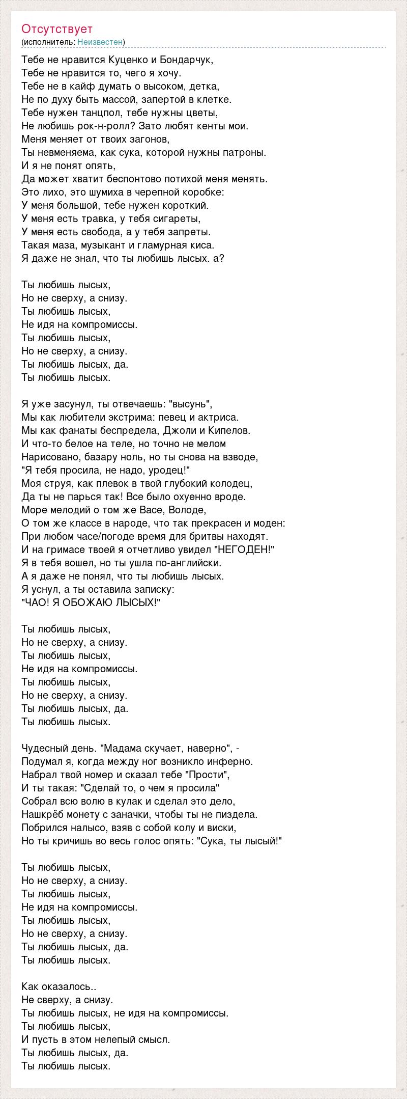 Тебе не нравится Куценко и Бондарчук, Тебе не нравится то, чего я хочу. Тебе не в кайф думать о высоком, детка, Не по духу быть массой, запертой в клетке. Тебе нужен танцпол, тебе нужны цветы, Не любишь рок-н-ролл? Зато любят кенты мои. Меня меняет от твоих загонов, Ты невменяема, как сука, которой нужны патроны. И я не понят опять, Да может хватит беспонтово потихой меня менять. Это лихо, это шумиха в черепной коробке: У меня большой, тебе нужен короткий. У меня есть травка, у тебя сигареты, У меня есть свобода, а у тебя запреты. Такая маза, музыкант и гламурная киса. Я даже не знал, что ты любишь лысых. а? Ты любишь лысых, Но не сверху, а снизу. Ты любишь лысых, Не идя на компромиссы. Ты любишь лысых, Но не сверху, а снизу. Ты любишь лысых, да. Ты любишь лысых. Я уже засунул, ты отвечаешь: "высунь", Мы как любители экстрима: певец и актриса. Мы как фанаты беспредела, Джоли и Кипелов. И что-то белое на теле, но точно не мелом Нарисовано, базару ноль, но ты снова на взводе, "Я тебя просила, не надо, уродец!" Моя струя, как плевок в твой глубокий колодец, Да ты не парься так! Все было охуенно вроде. Море мелодий о том же Васе, Володе, О том же классе в народе, что так прекрасен и моден: При любом часе/погоде время для бритвы находят. И на гримасе твоей я отчетливо увидел "НЕГОДЕН!" Я в тебя вошел, но ты ушла по-английски. А я даже не понял, что ты любишь лысых. Я уснул, а ты оставила записку: "ЧАО! Я ОБОЖАЮ ЛЫСЫХ!" Ты любишь лысых, Но не сверху, а снизу. Ты любишь лысых, Не идя на компромиссы. Ты любишь лысых, Но не сверху, а снизу. Ты любишь лысых, да. Ты любишь лысых. Чудесный день. "Мадама скучает, наверно", - Подумал я, когда между ног возникло инферно. Набрал твой номер и сказал тебе "Прости", И ты такая: "Сделай то, о чем я просила" Собрал всю волю в кулак и сделал это дело, Нашкрёб монету с заначки, чтобы ты не пиздела. Побрился налысо, взяв с собой колу и виски, Но ты кричишь во весь голос опять: "Сука, ты лысый!" Ты любишь лысых, Но не сверху, а снизу. Ты любишь лысых, Не идя на компромиссы. Ты любишь лысых, Но не сверху, а снизу. Ты любишь лысых, да. Ты любишь лысых. Как оказалось.. Не сверху, а снизу. Ты любишь лысых, не идя на компромиссы. Ты любишь лысых, И пусть в этом нелепый смысл. Ты любишь лысых, да. Ты любишь лысых.
