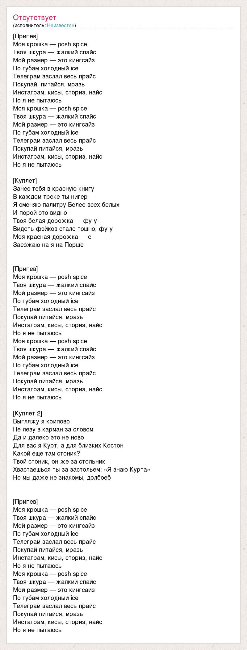 [Припев] Моя крошка — posh spice Твоя шкура — жалкий спайс Мой размер — это кингсайз По губам холодный ice Телеграм заслал весь прайс Покупай, питайся, мразь Инстаграм, кисы, сториз, найс Но я не пытаюсь Моя крошка — posh spice Твоя шкура — жалкий спайс Мой размер — это кингсайз По губам холодный ice Телеграм заслал весь прайс Покупай питайся, мразь Инстаграм, кисы, сториз, найс Но я не пытаюсь [Куплет] Занес тебя в красную книгу В каждом треке ты нигер Я сменяю палитру Белее всех белых И порой это видно Твоя белая дорожка — фу-у Видеть фэйков стало тошно, фу-у Моя красная дорожка — е Заезжаю на я на Порше [Припев] Моя крошка — posh spice Твоя шкура — жалкий спайс Мой размер — это кингсайз По губам холодный ice Телеграм заслал весь прайс Покупай питайся, мразь Инстаграм, кисы, сториз, найс Но я не пытаюсь Моя крошка — posh spice Твоя шкура — жалкий спайс Мой размер — это кингсайз По губам холодный ice Телеграм заслал весь прайс Покупай питайся, мразь Инстаграм, кисы, сториз, найс Но я не пытаюсь [Куплет 2] Выгляжу я крипово Не лезу в карман за словом Да и далеко это не ново Для вас я Курт, а для близких Костон Какой еще там стоник? Твой стоник, он же за стольник Хвастаешься ты за застольем: «Я знаю Курта» Но мы даже не знакомы, долбоеб [Припев] Моя крошка — posh spice Твоя шкура — жалкий спайс Мой размер — это кингсайз По губам холодный ice Телеграм заслал весь прайс Покупай питайся, мразь Инстаграм, кисы, сториз, найс Но я не пытаюсь Моя крошка — posh spice Твоя шкура — жалкий спайс Мой размер — это кингсайз По губам холодный ice Телеграм заслал весь прайс Покупай питайся, мразь Инстаграм, кисы, сториз, найс Но я не пытаюсь