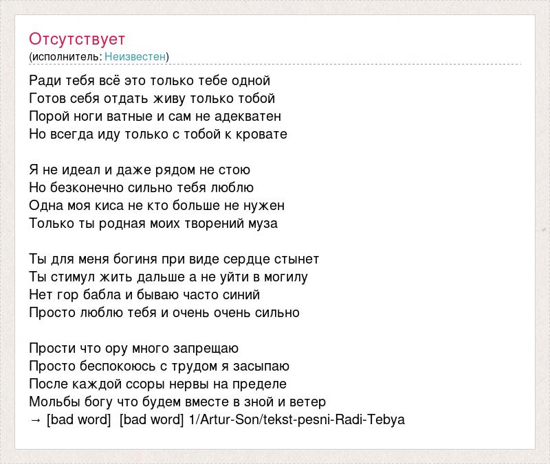 Ради тебя всё это только тебе одной Готов себя отдать живу только тобой Порой ноги ватные и сам не адекватен Но всегда иду только с тобой к кровате Я не идеал и даже рядом не стою Но безконечно сильно тебя люблю Одна моя киса не кто больше не нужен Только ты родная моих творений муза Ты для меня богиня при виде сердце стынет Ты стимул жить дальше а не уйти в могилу Нет гор бабла и бываю часто синий Просто люблю тебя и очень очень сильно Прости что ору много запрещаю Просто беспокоюсь с трудом я засыпаю После каждой ссоры нервы на пределе Мольбы богу что будем вместе в зной и ветер → [bad word] [bad word] 1/Artur-Son/tekst-pesni-Radi-Tebya