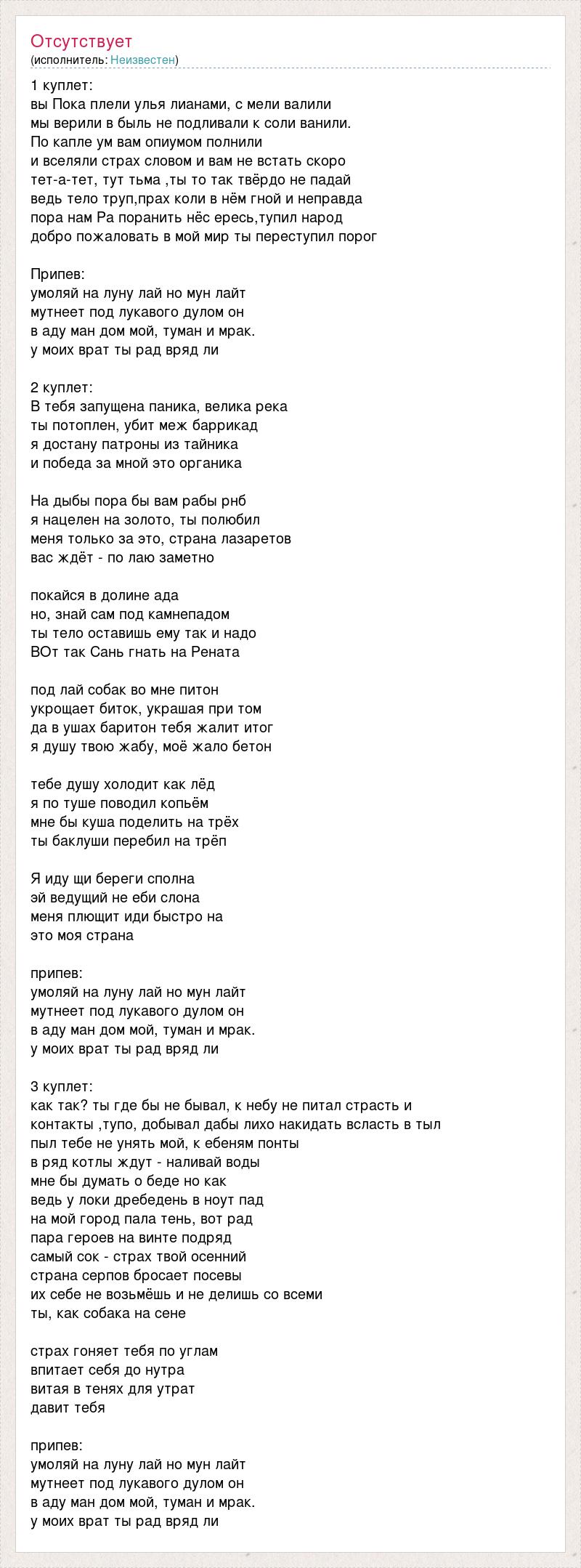 1 куплет: вы Пока плели улья лианами, с мели валили мы верили в быль не подливали к соли ванили. По капле ум вам опиумом полнили и вселяли страх словом и вам не встать скоро тет-а-тет, тут тьма ,ты то так твёрдо не падай ведь тело труп,прах коли в нём гной и неправда пора нам Ра поранить нёс ересь,тупил народ добро пожаловать в мой мир ты переступил порог Припев: умоляй на луну лай но мун лайт мутнеет под лукавого дулом он в аду ман дом мой, туман и мрак. у моих врат ты рад вряд ли 2 куплет: В тебя запущена паника, велика река ты потоплен, убит меж баррикад я достану патроны из тайника и победа за мной это органика На дыбы пора бы вам рабы рнб я нацелен на золото, ты полюбил меня только за это, страна лазаретов вас ждёт - по лаю заметно покайся в долине ада но, знай сам под камнепадом ты тело оставишь ему так и надо ВОт так Сань гнать на Рената под лай собак во мне питон укрощает биток, украшая при том да в ушах баритон тебя жалит итог я душу твою жабу, моё жало бетон тебе душу холодит как лёд я по туше поводил копьём мне бы куша поделить на трёх ты баклуши перебил на трёп Я иду щи береги сполна эй ведущий не еби слона меня плющит иди быстро на это моя страна припев: умоляй на луну лай но мун лайт мутнеет под лукавого дулом он в аду ман дом мой, туман и мрак. у моих врат ты рад вряд ли 3 куплет: как так? ты где бы не бывал, к небу не питал страсть и контакты ,тупо, добывал дабы лихо накидать всласть в тыл пыл тебе не унять мой, к ебеням понты в ряд котлы ждут - наливай воды мне бы думать о беде но как ведь у локи дребедень в ноут пад на мой город пала тень, вот рад пара героев на винте подряд самый сок - страх твой осенний страна серпов бросает посевы иx себе не возьмёшь и не делишь со всеми ты, как собака на сене страх гоняет тебя по углам впитает себя до нутра витая в тенях для утрат давит тебя припев: умоляй на луну лай но мун лайт мутнеет под лукавого дулом он в аду ман дом мой, туман и мрак. у моих врат ты рад вряд ли
