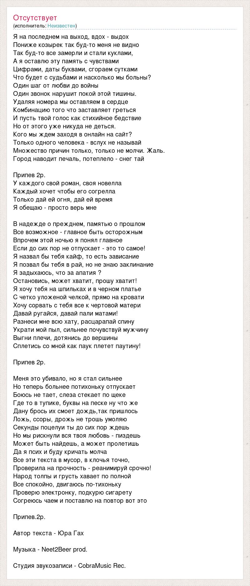 Я на последнем на выход, вдох - выдох Пониже козырек так буд-то меня не видно Так буд-то все замерли и стали куклами, А я оставлю эту память с чувствами Цифрами, даты буквами, сгораем сутками Что будет с судьбами и насколько мы больны? Один шаг от любви до войны Один звонок нарушит покой этой тишины. Удаляя номера мы оставляем в сердце Комбинацию того что заставляет греться И пусть твой голос как стихийное бедствие Но от этого уже никуда не деться. Кого мы ждем заходя в онлайн на сайт? Только одного человека - вслух не называй Множество причин только, только не молчи. Жаль. Город наводит печаль, потеплело - снег тай Припев 2р. У каждого свой роман, своя новелла Каждый хочет чтобы его согрелла Только дай ей огня, дай ей время Я обещаю - просто верь мне В надежде о прежднем, памятью о прошлом Все возможное - главное быть осторожным Впрочем этой ночью я понял главное Если до сих пор не отпускает - это то самое! Я назвал бы тебя кайф, то есть зависание Я позвал бы тебя в рай, но не знаю заклинание Я задыхаюсь, что за апатия ? Остановись, может хватит, прошу хватит! Я хочу тебя на шпильках и в черном платье С четко уложеной челкой, прямо на кровати Хочу сорвать с тебя все к чертовой матери Давай ругайся, давай пали матами! Разнеси мне всю хату, расцарапай спину Украти мой пыл, сильнее почувствуй мужчину Выгни плечи, дотянись до вершины Сплетись со мной как паук плетет паутину! Припев 2р. Меня это убивало, но я стал сильнее Но теперь больнее потихоньку отпускает Боюсь не тает, слеза стекает по щеке Где то в тупике, буквы на песке ну что же Дану брось их смоет дождь,так пришлось Ложь, ссоры, дрожь не трошь умоляю Секунды поцелуи ты до сих пор ждешь Но мы рискнули вся твоя любовь - пиздешь Может быть найдешь, а может пролетишь Да я псих и буду кричать молча Все эти текста в мусор, в клочья точно, Проверила на прочность - реанимируй срочно! Народ толпы и грусть хавает по полной Все спокойно, двигаюсь по-тихоньку Проверю электронку, подкурю сигарету Согреюсь чаем и поставлю на повтор вот это Припев.2р. Автор текста - Юра Гах Музыка - Neet2Beer prod. Студия звукозаписи - CobraMusic Rec.