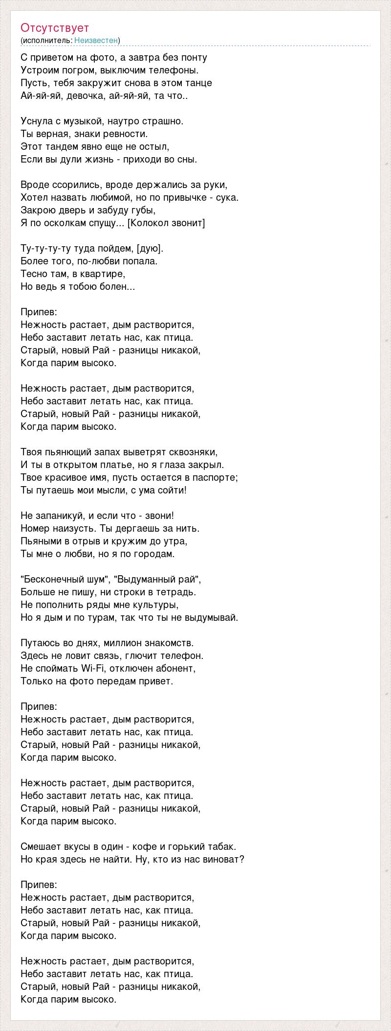 С приветом на фото, а завтра без понту Устроим погром, выключим телефоны. Пусть, тебя закружит снова в этом танце Ай-яй-яй, девочка, ай-яй-яй, та что.. Уснула с музыкой, наутро страшно. Ты верная, знаки ревности. Этот тандем явно еще не остыл, Если вы дули жизнь - приходи во сны. Вроде ссорились, вроде держались за руки, Хотел назвать любимой, но по привычке - сука. Закрою дверь и забуду губы, Я по осколкам спущу... [Колокол звонит] Ту-ту-ту-ту туда пойдем, [дую]. Более того, по-любви попала. Тесно там, в квартире, Но ведь я тобою болен... Припев: Нежность растает, дым растворится, Небо заставит летать нас, как птица. Старый, новый Рай - разницы никакой, Когда парим высоко. Нежность растает, дым растворится, Небо заставит летать нас, как птица. Старый, новый Рай - разницы никакой, Когда парим высоко. Твоя пьянющий запах выветрят сквозняки, И ты в открытом платье, но я глаза закрыл. Твое красивое имя, пусть остается в паспорте; Ты путаешь мои мысли, с ума сойти! Не запаникуй, и если что - звони! Номер наизусть. Ты дергаешь за нить. Пьяными в отрыв и кружим до утра, Ты мне о любви, но я по городам. "Бесконечный шум", "Выдуманный рай", Больше не пишу, ни строки в тетрадь. Не пополнить ряды мне культуры, Но я дым и по турам, так что ты не выдумывай. Путаюсь во днях, миллион знакомств. Здесь не ловит связь, глючит телефон. Не споймать Wi-Fi, отключен абонент, Только на фото передам привет. Припев: Нежность растает, дым растворится, Небо заставит летать нас, как птица. Старый, новый Рай - разницы никакой, Когда парим высоко. Нежность растает, дым растворится, Небо заставит летать нас, как птица. Старый, новый Рай - разницы никакой, Когда парим высоко. Смешает вкусы в один - кофе и горький табак. Но края здесь не найти. Ну, кто из нас виноват? Припев: Нежность растает, дым растворится, Небо заставит летать нас, как птица. Старый, новый Рай - разницы никакой, Когда парим высоко. Нежность растает, дым растворится, Небо заставит летать нас, как птица. Старый, новый Рай - разницы никакой, Когда парим высоко.