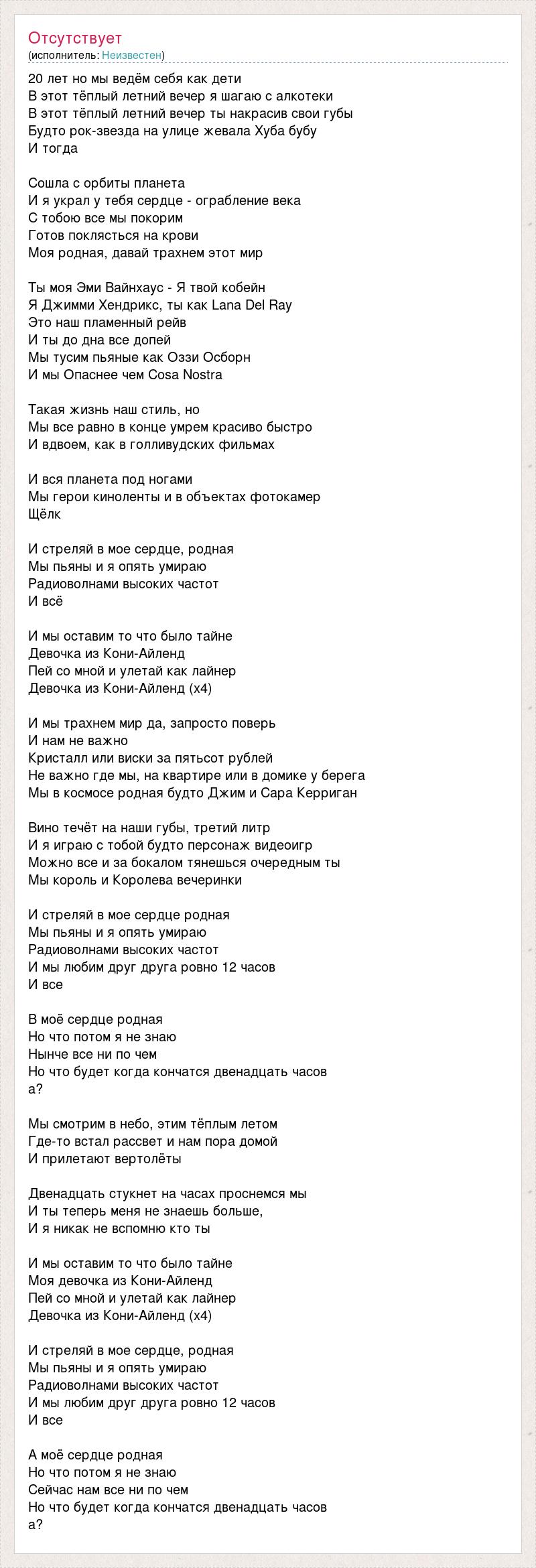 20 лет но мы ведём себя как дети В этот тёплый летний вечер я шагаю с алкотеки В этот тёплый летний вечер ты накрасив свои губы Будто рок-звезда на улице жевала Хуба бубу И тогда Сошла с орбиты планета И я украл у тебя сердце - ограбление века С тобою все мы покорим Готов поклясться на крови Моя родная, давай трахнем этот мир Ты моя Эми Вайнхаус - Я твой кобейн Я Джимми Хендрикс, ты как Lana Del Ray Это наш пламенный рейв И ты до дна все допей Мы тусим пьяные как Оззи Осборн И мы Опаснее чем Cosa Nostra Такая жизнь наш стиль, но Мы все равно в конце умрем красиво быстро И вдвоем, как в голливудских фильмах И вся планета под ногами Мы герои киноленты и в объектах фотокамер Щёлк И стреляй в мое сердце, родная Мы пьяны и я опять умираю Радиоволнами высоких частот И всё И мы оставим то что было тайне Девочка из Кони-Айленд Пей со мной и улетай как лайнер Девочка из Кони-Айленд (х4) И мы трахнем мир да, запросто поверь И нам не важно Кристалл или виски за пятьсот рублей Не важно где мы, на квартире или в домике у берега Мы в космосе родная будто Джим и Сара Керриган Вино течёт на наши губы, третий литр И я играю с тобой будто персонаж видеоигр Можно все и за бокалом тянешься очередным ты Мы король и Королева вечеринки И стреляй в мое сердце родная Мы пьяны и я опять умираю Радиоволнами высоких частот И мы любим друг друга ровно 12 часов И все В моё сердце родная Но что потом я не знаю Нынче все ни по чем Но что будет когда кончатся двенадцать часов а? Мы смотрим в небо, этим тёплым летом Где-то встал рассвет и нам пора домой И прилетают вертолёты Двенадцать стукнет на часах проснемся мы И ты теперь меня не знаешь больше, И я никак не вспомню кто ты И мы оставим то что было тайне Моя девочка из Кони-Айленд Пей со мной и улетай как лайнер Девочка из Кони-Айленд (х4) И стреляй в мое сердце, родная Мы пьяны и я опять умираю Радиоволнами высоких частот И мы любим друг друга ровно 12 часов И все А моё сердце родная Но что потом я не знаю Сейчас нам все ни по чем Но что будет когда кончатся двенадцать часов а?