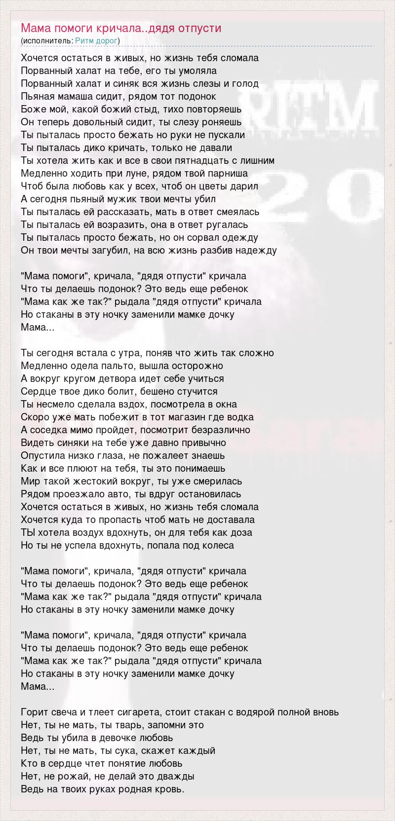 Хочется остаться в живых, но жизнь тебя сломала Порванный халат на тебе, его ты умоляла Порванный халат и синяк вся жизнь слезы и голод Пьяная мамаша сидит, рядом тот подонок Боже мой, какой божий стыд, тихо повторяешь Он теперь довольный сидит, ты слезу роняешь Ты пыталась просто бежать но руки не пускали Ты пыталась дико кричать, только не давали Ты хотела жить как и все в свои пятнадцать с лишним Медленно ходить при луне, рядом твой парниша Чтоб была любовь как у всех, чтоб он цветы дарил А сегодня пьяный мужик твои мечты убил Ты пыталась ей рассказать, мать в ответ смеялась Ты пыталась ей возразить, она в ответ ругалась Ты пыталась просто бежать, но он сорвал одежду Он твои мечты загубил, на всю жизнь разбив надежду "Мама помоги", кричала, "дядя отпусти" кричала Что ты делаешь подонок? Это ведь еще ребенок "Мама как же так?" рыдала "дядя отпусти" кричала Но стаканы в эту ночку заменили мамке дочку Мама... Ты сегодня встала с утра, поняв что жить так сложно Медленно одела пальто, вышла осторожно А вокруг кругом детвора идет себе учиться Сердце твое дико болит, бешено стучится Ты несмело сделала вздох, посмотрела в окна Скоро уже мать побежит в тот магазин где водка А соседка мимо пройдет, посмотрит безразлично Видеть синяки на тебе уже давно привычно Опустила низко глаза, не пожалеет знаешь Как и все плюют на тебя, ты это понимаешь Мир такой жестокий вокруг, ты уже смерилась Рядом проезжало авто, ты вдруг остановилась Хочется остаться в живых, но жизнь тебя сломала Хочется куда то пропасть чтоб мать не доставала ТЫ хотела воздух вдохнуть, он для тебя как доза Но ты не успела вдохнуть, попала под колеса "Мама помоги", кричала, "дядя отпусти" кричала Что ты делаешь подонок? Это ведь еще ребенок "Мама как же так?" рыдала "дядя отпусти" кричала Но стаканы в эту ночку заменили мамке дочку "Мама помоги", кричала, "дядя отпусти" кричала Что ты делаешь подонок? Это ведь еще ребенок "Мама как же так?" рыдала "дядя отпусти" кричала Но стаканы в эту ночку заменили мамке дочку Мама... Горит свеча и тлеет сигарета, стоит стакан с водярой полной вновь Нет, ты не мать, ты тварь, запомни это Ведь ты убила в девочке любовь Нет, ты не мать, ты сука, скажет каждый Кто в сердце чтет понятие любовь Нет, не рожай, не делай это дважды Ведь на твоих руках родная кровь.