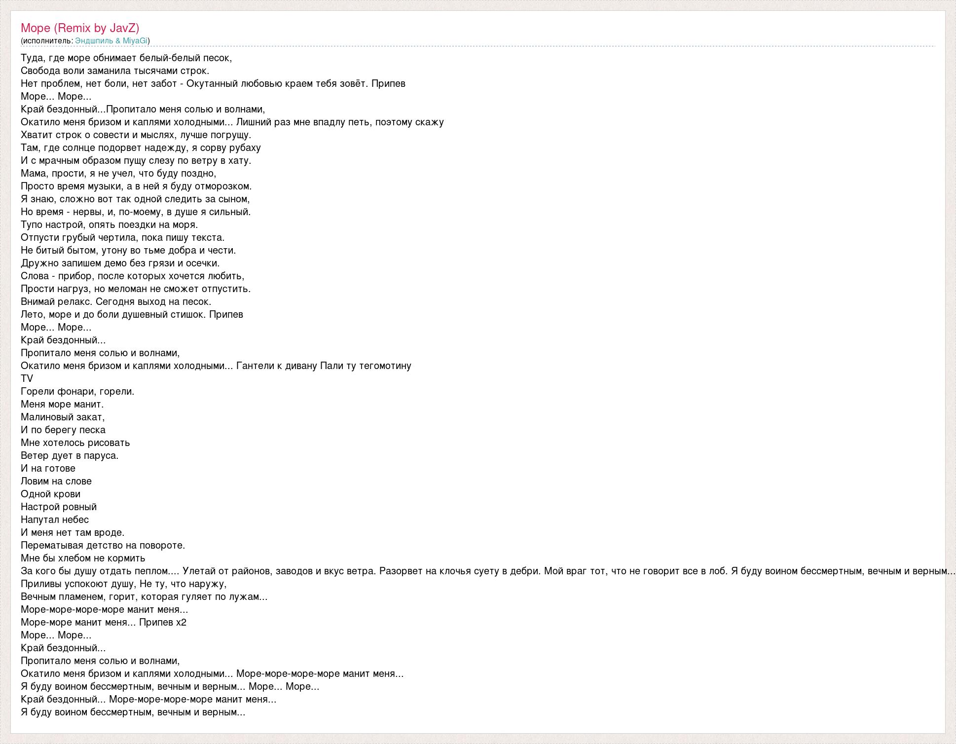 Туда, где море обнимает белый-белый песок, Свобода воли заманила тысячами строк. Нет проблем, нет боли, нет забот - Окутанный любовью краем тебя зовёт. Припев Море... Море... Край бездонный...Пропитало меня солью и волнами, Окатило меня бризом и каплями холодными... Лишний раз мне впадлу петь, поэтому скажу Хватит строк о совести и мыслях, лучше погрущу. Там, где солнце подорвет надежду, я сорву рубаху И с мрачным образом пущу слезу по ветру в хату. Мама, прости, я не учел, что буду поздно, Просто время музыки, а в ней я буду отморозком. Я знаю, сложно вот так одной следить за сыном, Но время - нервы, и, по-моему, в душе я сильный. Тупо настрой, опять поездки на моря. Отпусти грубый чертила, пока пишу текста. Не битый бытом, утону во тьме добра и чести. Дружно запишем демо без грязи и осечки. Слова - прибор, после которых хочется любить, Прости нагруз, но меломан не сможет отпустить. Внимай релакс. Сегодня выход на песок. Лето, море и до боли душевный стишок. Припев Море... Море... Край бездонный... Пропитало меня солью и волнами, Окатило меня бризом и каплями холодными... Гантели к дивану Пали ту тегомотину TV Горели фонари, горели. Меня море манит. Малиновый закат, И по берегу песка Мне хотелось рисовать Ветер дует в паруса. И на готове Ловим на слове Одной крови Настрой ровный Напутал небес И меня нет там вроде. Перематывая детство на повороте. Мне бы хлебом не кормить За кого бы душу отдать пеплом.... Улетай от районов, заводов и вкус ветра. Разорвет на клочья суету в дебри. Мой враг тот, что не говорит все в лоб. Я буду воином бессмертным, вечным и верным... Приливы успокоют душу, Не ту, что наружу, Вечным пламенем, горит, которая гуляет по лужам... Море-море-море-море манит меня... Море-море манит меня... Припев х2 Море... Море... Край бездонный... Пропитало меня солью и волнами, Окатило меня бризом и каплями холодными... Море-море-море-море манит меня... Я буду воином бессмертным, вечным и верным... Море... Море... Край бездонный... Море-море-море-море манит меня... Я буду воином бессмертным, вечным и верным...