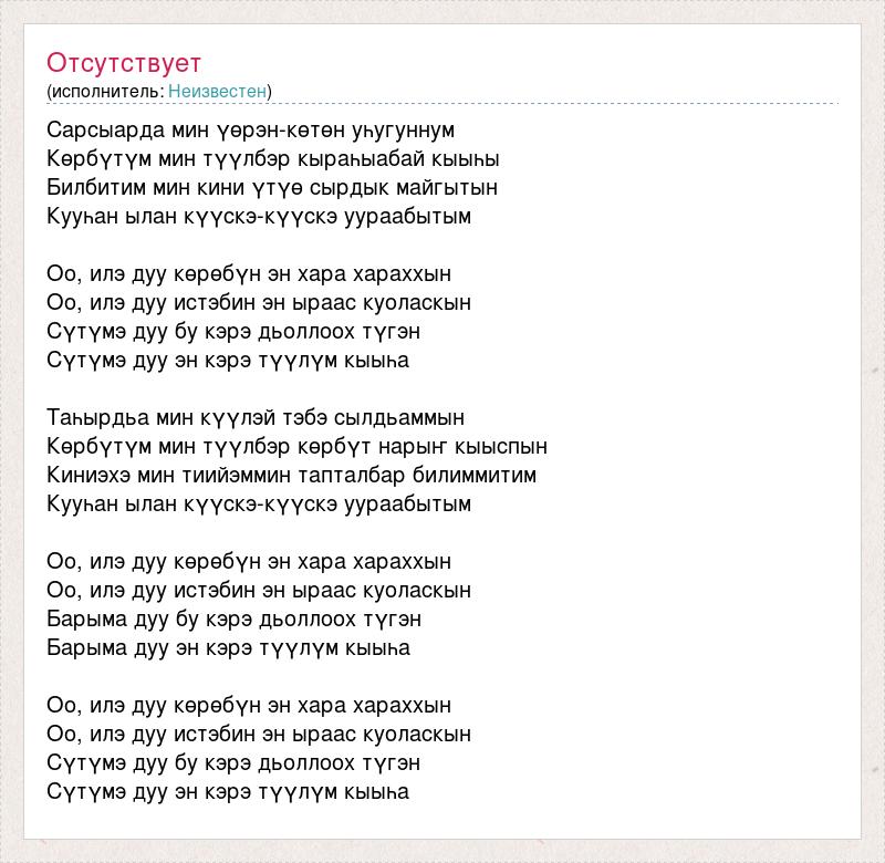 Сарсыарда мин үөрэн-көтөн уһугуннум Көрбүтүм мин түүлбэр кыраһыабай кыыһы Билбитим мин кини үтүө сырдык майгытын Кууһан ылан күүскэ-күүскэ уураабытым Оо, илэ дуу көрөбүн эн хара хараххын Оо, илэ дуу истэбин эн ыраас куоласкын Сүтүмэ дуу бу кэрэ дьоллоох түгэн Сүтүмэ дуу эн кэрэ түүлүм кыыһа Таһырдьа мин күүлэй тэбэ сылдьаммын Көрбүтүм мин түүлбэр көрбүт нарыҥ кыыспын Киниэхэ мин тиийэммин тапталбар билиммитим Кууһан ылан күүскэ-күүскэ уураабытым Оо, илэ дуу көрөбүн эн хара хараххын Оо, илэ дуу истэбин эн ыраас куоласкын Барыма дуу бу кэрэ дьоллоох түгэн Барыма дуу эн кэрэ түүлүм кыыһа Оо, илэ дуу көрөбүн эн хара хараххын Оо, илэ дуу истэбин эн ыраас куоласкын Сүтүмэ дуу бу кэрэ дьоллоох түгэн Сүтүмэ дуу эн кэрэ түүлүм кыыһа