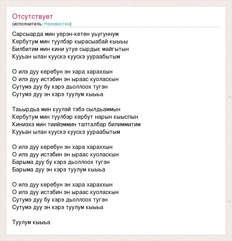 Сарсыарда мин уерэн-кетен уьугуннум Кербутум мин туулбэр кырасыабай кыыьы Билбитим мин кини утуе сырдык майгытын Кууьан ылан куускэ куускэ уураабытым О илэ дуу керебун эн хара хараххын О илэ дуу истэбин эн ыраас куоласкын Сутумэ дуу бу кэрэ дьоллоох тугэн Сутумэ дуу эн кэрэ туулум кыыьа Таьырдьа мин куулэй тэбэ сылдьаммын Кербутум мин туулбэр кербут нарын кыыспын Киниэхэ мин тиийэммин тапталбар билиммитим Кууьан ылан куускэ куускэ уураабытым О илэ дуу керебун эн хара хараххын О илэ дуу истэбин эн ыраас куоласкын Барыма дуу бу кэрэ дьоллоох тугэн Барыма дуу эн кэрэ туулум кыыьа О илэ дуу керебун эн хара хараххын О илэ дуу истэбин эн ыраас куоласкын Сутумэ дуу бу кэрэ дьоллоох тугэн Сутумэ дуу эн кэрэ туулум кыыьа Туулум кыыьа