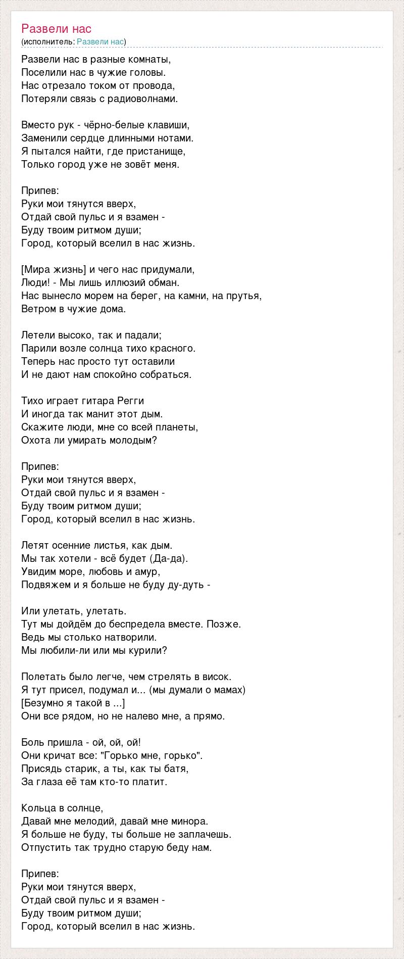 Развели нас в разные комнаты, Поселили нас в чужие головы. Нас отрезало током от провода, Потеряли связь с радиоволнами. Вместо рук - чёрно-белые клавиши, Заменили сердце длинными нотами. Я пытался найти, где пристанище, Только город уже не зовёт меня. Припев: Руки мои тянутся вверх, Отдай свой пульс и я взамен - Буду твоим ритмом души; Город, который вселил в нас жизнь. [Мира жизнь] и чего нас придумали, Люди! - Мы лишь иллюзий обман. Нас вынесло морем на берег, на камни, на прутья, Ветром в чужие дома. Летели высоко, так и падали; Парили возле солнца тихо красного. Теперь нас просто тут оставили И не дают нам спокойно собраться. Тихо играет гитара Регги И иногда так манит этот дым. Скажите люди, мне со всей планеты, Охота ли умирать молодым? Припев: Руки мои тянутся вверх, Отдай свой пульс и я взамен - Буду твоим ритмом души; Город, который вселил в нас жизнь. Летят осенние листья, как дым. Мы так хотели - всё будет (Да-да). Увидим море, любовь и амур, Подвяжем и я больше не буду ду-дуть - Или улетать, улетать. Тут мы дойдём до беспредела вместе. Позже. Ведь мы столько натворили. Мы любили-ли или мы курили? Полетать было легче, чем стрелять в висок. Я тут присел, подумал и... (мы думали о мамах) [Безумно я такой в ...] Они все рядом, но не налево мне, а прямо. Боль пришла - ой, ой, ой! Они кричат все: "Горько мне, горько". Присядь старик, а ты, как ты батя, За глаза её там кто-то платит. Кольца в солнце, Давай мне мелодий, давай мне минора. Я больше не буду, ты больше не заплачешь. Отпустить так трудно старую беду нам. Припев: Руки мои тянутся вверх, Отдай свой пульс и я взамен - Буду твоим ритмом души; Город, который вселил в нас жизнь.