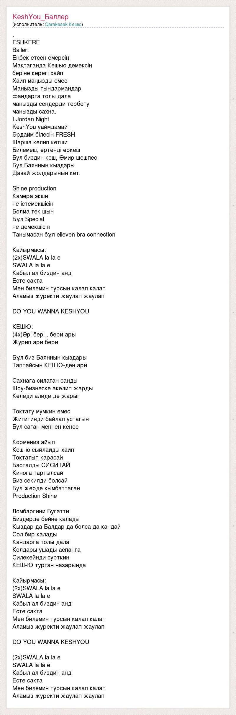 . ESHKERE Baller: Еңбек етсен емерсің Мақтағанда Кешью демексің бәріне керегі хайп Хайп маңызды емес Манызды тындармандар фандарга толы дала манызды сендерди тербету манызды сахна. I Jordan Night KeshYou уаймдамайт Әрдайм білесін FRESH Шарша келип кетши Билемеш, өртенді өркеш Бул биздин кеш, Өмир шешпес Бул Баяннын кыздары Давай жолдарынын кет. Shine production Камера экшн не істемекшісін Болма тек шын Бұл Special не демекшісін Танымасан бұл elleven bra connection Кайырмасы: (2х)SWALA la la e SWALA la la e Кабыл ал биздин анді Есте сакта Мен билемин турсын калап калап Аламыз журекти жаулап жаулап DO YOU WANNA KESHYOU КЕШЮ: (4х)Әрі бері , бери ары Журип ари бери Бұл биз Баяннын кыздары Таппайсын КЕШЮ-ден ари Сахнага силаган санды Шоу-бизнеске акелип жарды Келеди алиде де жарып Токтату мумкин емес Жигитинди байлап устагын Бул саган меннен кенес Кормениз айып Кеш-ю сыйлайды хайп Токтатып карасай Басталды СИСИТАЙ Кинога тартылсай Биз секилди болсай Бул жерде кымбаттаган Production Shine Ломбаргини Бугатти Биздерде бейне калады Кыздар да Балдар да болса да кандай Сол бир калады Кандарга толы дала Колдары ушады аспанга Силекейнди сурткин КЕШ-Ю турган назарында Кайырмасы: (2х)SWALA la la e SWALA la la e Кабыл ал биздин анді Есте сакта Мен билемин турсын калап калап Аламыз журекти жаулап жаулап DO YOU WANNA KESHYOU (2х)SWALA la la e SWALA la la e Кабыл ал биздин анді Есте сакта Мен билемин турсын калап калап Аламыз журекти жаулап жаулап