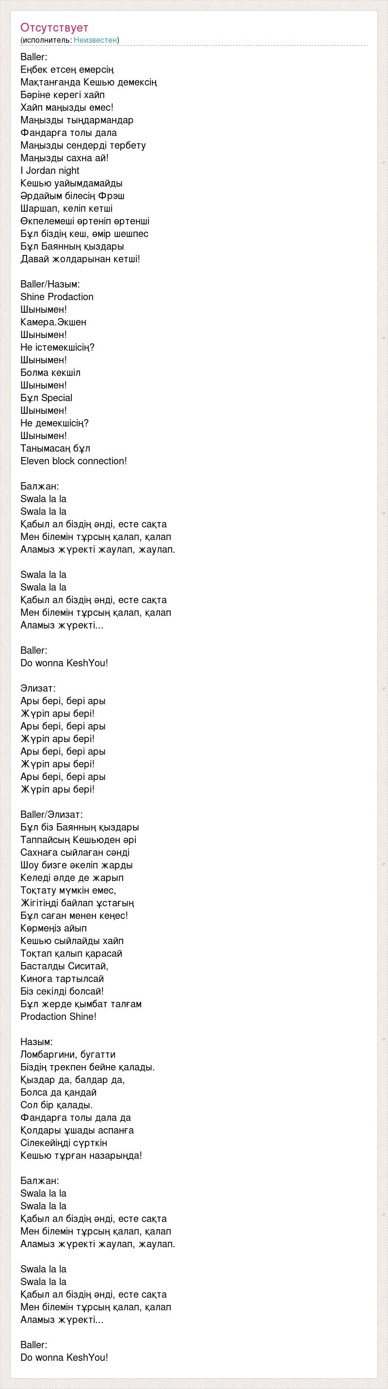 Baller: Еңбек етсең емерсің Мақтанғанда Кешью демексің Бәріне керегі хайп Хайп маңызды емес! Маңызды тыңдармандар Фандарға толы дала Маңызды сендерді тербету Маңызды сахна ай! I Jordan night Кешью уайымдамайды Әрдайым білесің Фрэш Шаршап, келіп кетші Өкпелемеші өртеніп өртенші Бұл біздің кеш, өмір шешпес Бұл Баянның қыздары Давай жолдарынан кетші! Baller/Назым: Shine Prodaction Шынымен! Камера.Экшен Шынымен! Не істемекшісің? Шынымен! Болма кекшіл Шынымен! Бұл Special Шынымен! Не демекшісің? Шынымен! Танымасаң бұл Eleven block connection! Балжан: Swala la la Swala la la Қабыл ал біздің әнді, есте сақта Мен білемін тұрсың қалап, қалап Аламыз жүректі жаулап, жаулап. Swala la la Swala la la Қабыл ал біздің әнді, есте сақта Мен білемін тұрсың қалап, қалап Аламыз жүректi... Baller: Do wonna KeshYou! Элизат: Ары бері, бері ары Жүріп ары бері! Ары бері, бері ары Жүріп ары бері! Ары бері, бері ары Жүріп ары бері! Ары бері, бері ары Жүріп ары бері! Baller/Элизат: Бұл біз Баянның қыздары Таппайcың Кешьюден әрі Сахнаға сыйлаған сәнді Шоу бизге әкеліп жарды Келеді әлде де жарып Тоқтату мүмкін емес, Жігітіңді байлап ұстағың Бұл саған менен кеңес! Көрмеңіз айып Кешью сыйлайды хайп Тоқтап қалып қарасай Басталды Сиситай, Киноға тартылсай Біз секілді болсай! Бұл жерде қымбат талғам Prodaction Shine! Назым: Ломбаргини, бугатти Біздің трекпен бейне қалады. Қыздар да, балдар да, Болса да қандай Сол бір қалады. Фандарға толы дала да Қолдары ұшады аспанға Сілекейіңді сүрткін Кешью тұрған назарыңда! Балжан: Swala la la Swala la la Қабыл ал біздің әнді, есте сақта Мен білемін тұрсың қалап, қалап Аламыз жүректі жаулап, жаулап. Swala la la Swala la la Қабыл ал біздің әнді, есте сақта Мен білемін тұрсың қалап, қалап Аламыз жүректі... Baller: Do wonna KeshYou!