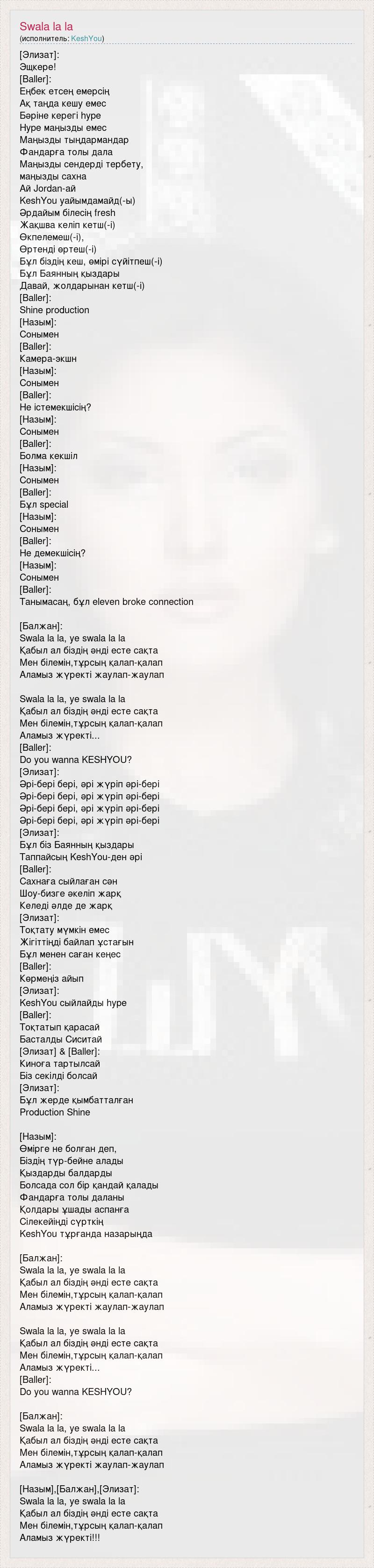 [Элизат]: Эщкере! [Baller]: Еңбек етсең емерсің Ақ таңда кешу емес Бәріне керегі hype Hype маңызды емес Маңызды тыңдармандар Фандарға толы дала Маңызды сендерді тербету, маңызды сахна Ай Jordan-ай KeshYou уайымдамайд(-ы) Әрдайым білесің fresh Жақшва келіп кетш(-і) Өкпелемеш(-і), Өртенді өртеш(-і) Бұл біздің кеш, өмірі сүйітпеш(-і) Бұл Баянның қыздары Давай, жолдарынан кетш(-і) [Baller]: Shine production [Назым]: Сонымен [Baller]: Камера-экшн [Назым]: Сонымен [Baller]: Не істемекшісің? [Назым]: Сонымен [Baller]: Болма кекшіл [Назым]: Сонымен [Baller]: Бұл special [Назым]: Сонымен [Baller]: Не демекшісің? [Назым]: Сонымен [Baller]: Танымасаң, бұл eleven broke connection [Балжан]: Swala la la, ye swala la la Қабыл ал біздің әнді есте сақта Мен білемін,тұрсың қалап-қалап Аламыз жүректі жаулап-жаулап Swala la la, ye swala la la Қабыл ал біздің әнді есте сақта Мен білемін,тұрсың қалап-қалап Аламыз жүректі... [Baller]: Do you wanna KESHYOU? [Элизат]: Әрі-бері бері, әрі жүріп әрі-бері Әрі-бері бері, әрі жүріп әрі-бері Әрі-бері бері, әрі жүріп әрі-бері Әрі-бері бері, әрі жүріп әрі-бері [Элизат]: Бұл біз Баянның қыздары Таппайсың KeshYou-ден әрі [Baller]: Сахнаға сыйлаған сән Шоу-бизге әкеліп жарқ Келеді әлде де жарқ [Элизат]: Тоқтату мүмкін емес Жігіттіңді байлап ұстағын Бұл менен саған кеңес [Baller]: Көрмеңіз айып [Элизат]: KeshYou сыйлайды hype [Baller]: Тоқтатып қарасай Басталды Сиситай [Элизат] & [Baller]: Киноға тартылсай Біз секілді болсай [Элизат]: Бұл жерде қымбатталған Production Shine [Назым]: Өмірге не болған деп, Біздің түр-бейне алады Қыздарды балдарды Болсада сол бір қандай қалады Фандарға толы даланы Қолдары ұшады аспанға Сілекейіңді сүрткің KeshYou тұрғанда назарыңда [Балжан]: Swala la la, ye swala la la Қабыл ал біздің әнді есте сақта Мен білемін,тұрсың қалап-қалап Аламыз жүректі жаулап-жаулап Swala la la, ye swala la la Қабыл ал біздің әнді есте сақта Мен білемін,тұрсың қалап-қалап Аламыз жүректі... [Baller]: Do you wanna KESHYOU? [Балжан]: Swala la la, ye swala la la Қабыл ал біздің әнді есте сақта Мен білемін,тұрсың қалап-қалап Аламыз жүректі жаулап-жаулап [Назым],[Балжан],[Элизат]: Swala la la, ye swala la la Қабыл ал біздің әнді есте сақта Мен білемін,тұрсың қалап-қалап Аламыз жүректі!!!